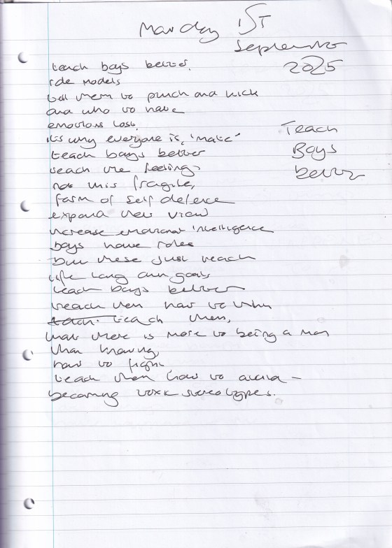 Teach Boys Better – Written Monday 1st September 2025 (Aged 50)