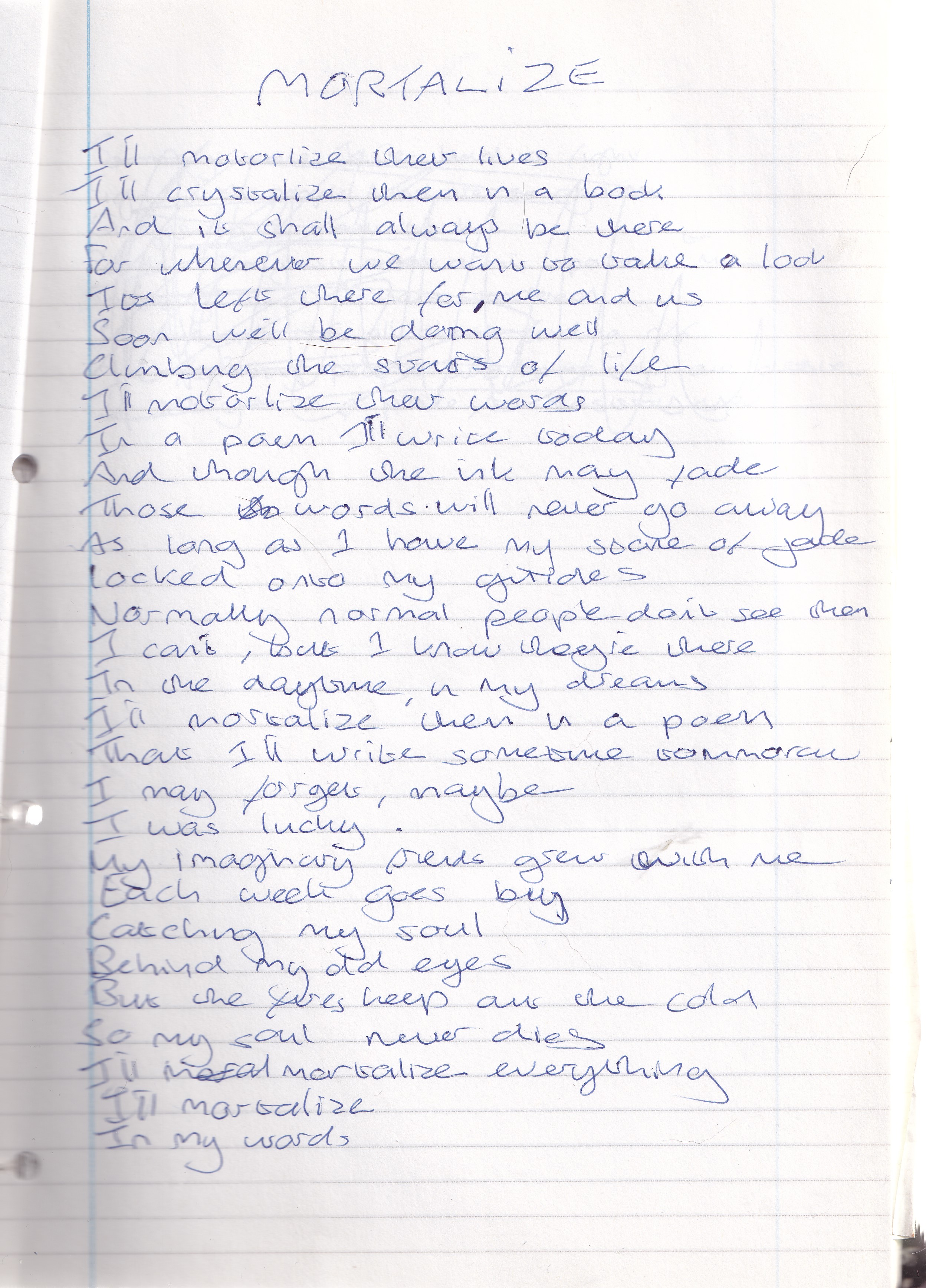i will mortalise their lives i will crystalise them in a book and it shall always be there for whenever we want to take a look it is left for me and us soon we will be doing well climbing the stairs of life i will mortalise their words in a poem that i will write today and though the ink may fade those words will never go away as long as i have my stone jade locked into my guides normally, normal people do not see them i can't but i know they are there in the daytime, in my dreams i will mortalise them in a poem that i will write sometime tomorrow i may forget, maybe i was lucky, my imaginary friends grew with me each week goes by catching my soul behind my old eyes but the fires keep out the cold so my soul never dies i will mortalise everything i will mortalise myself in my words
