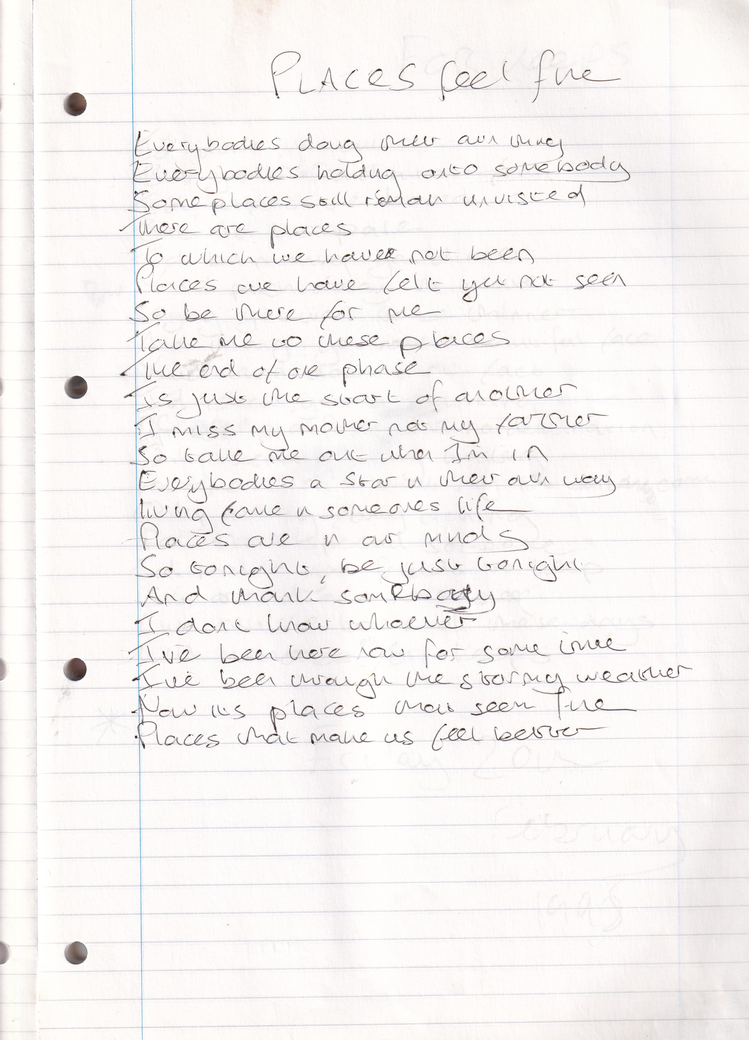 everybody is doing their own thing everybody is holding onto somebody some places still remain unvisited there are places, to which we have never been places we have felt - yet, not seen so be there for me take me to those places the end of one phase is just the start of another i miss my mother not my father so take me out when i am in everybody is a star in their own way living fame in someone's life places are in our minds so tonight, just be tonight i do not know whoever i have been here now for some time i have been through the stormy weather now it is places that seem fine places that make us feel better