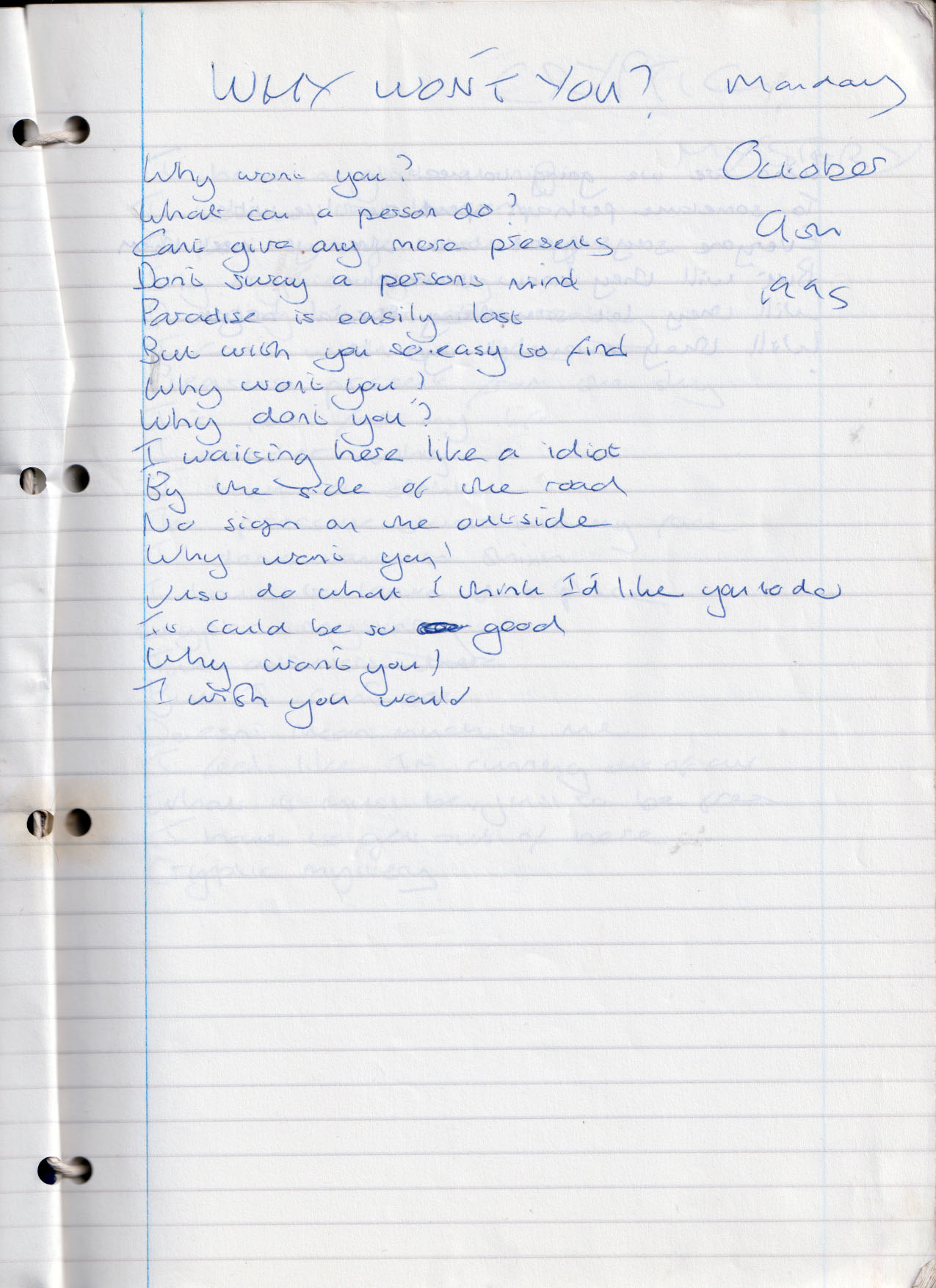 why won't you? what can a person do? cannot give anymore presents do not sway in a person's mind paradise is easily lost but with you, so easy to find why won't you? why don't you? i am waiting here like an idiot by the side of the road no sign on the outside why won't you just do what i think i'd like you to do it could be good why won't you? i wish you would