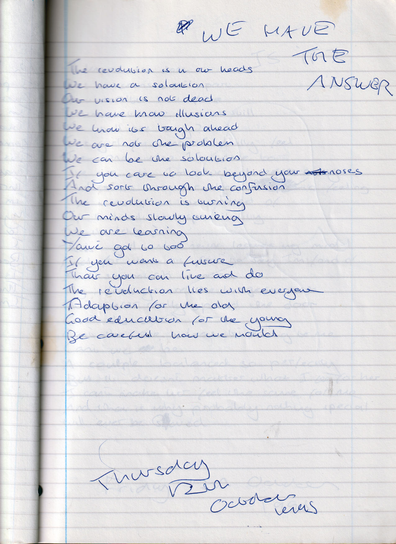 the revolution is in our heads we have a solution our vision is not dead we have knowing illusions we know it is tough ahead we are not the problem we can be the solution if you care to look beyond your nose's and sort through the confusion the revolution is turning our minds slowly tuning we are learning you have got to as well if you want a future that you can live and do the revolution lies with everyone adaption for the old good education for the young be careful how we mould