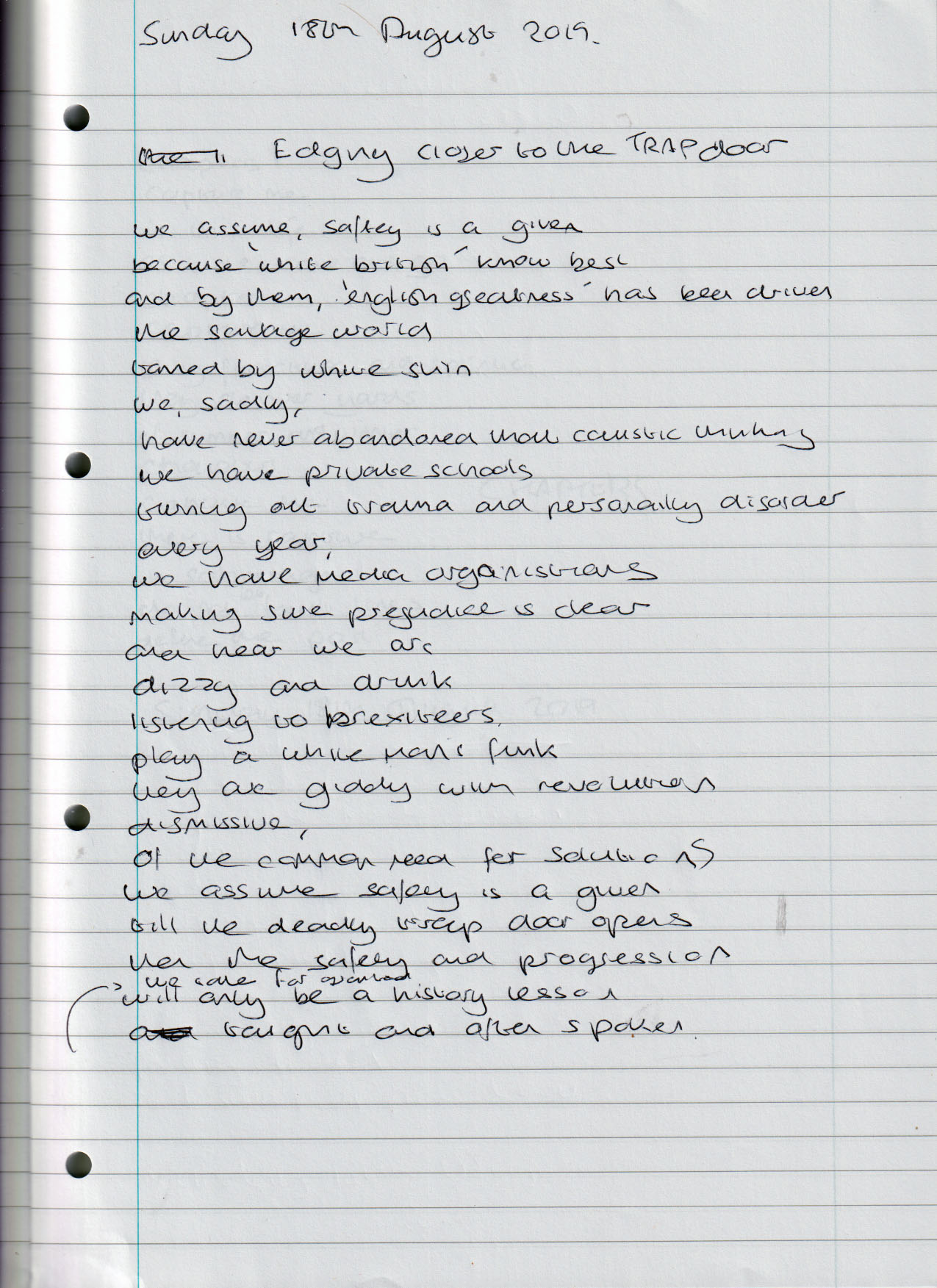 Edging Closer to the Trap Door – Sunday 18th August 2019