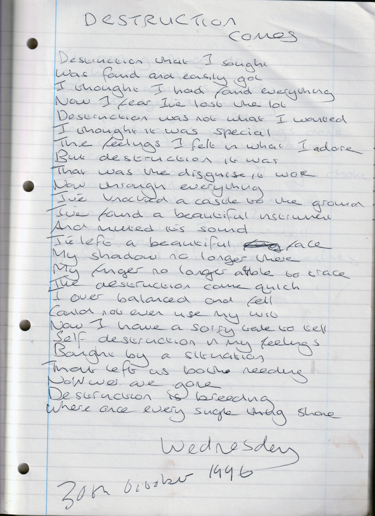 Destruction Comes – Wednesday 30th October 1996