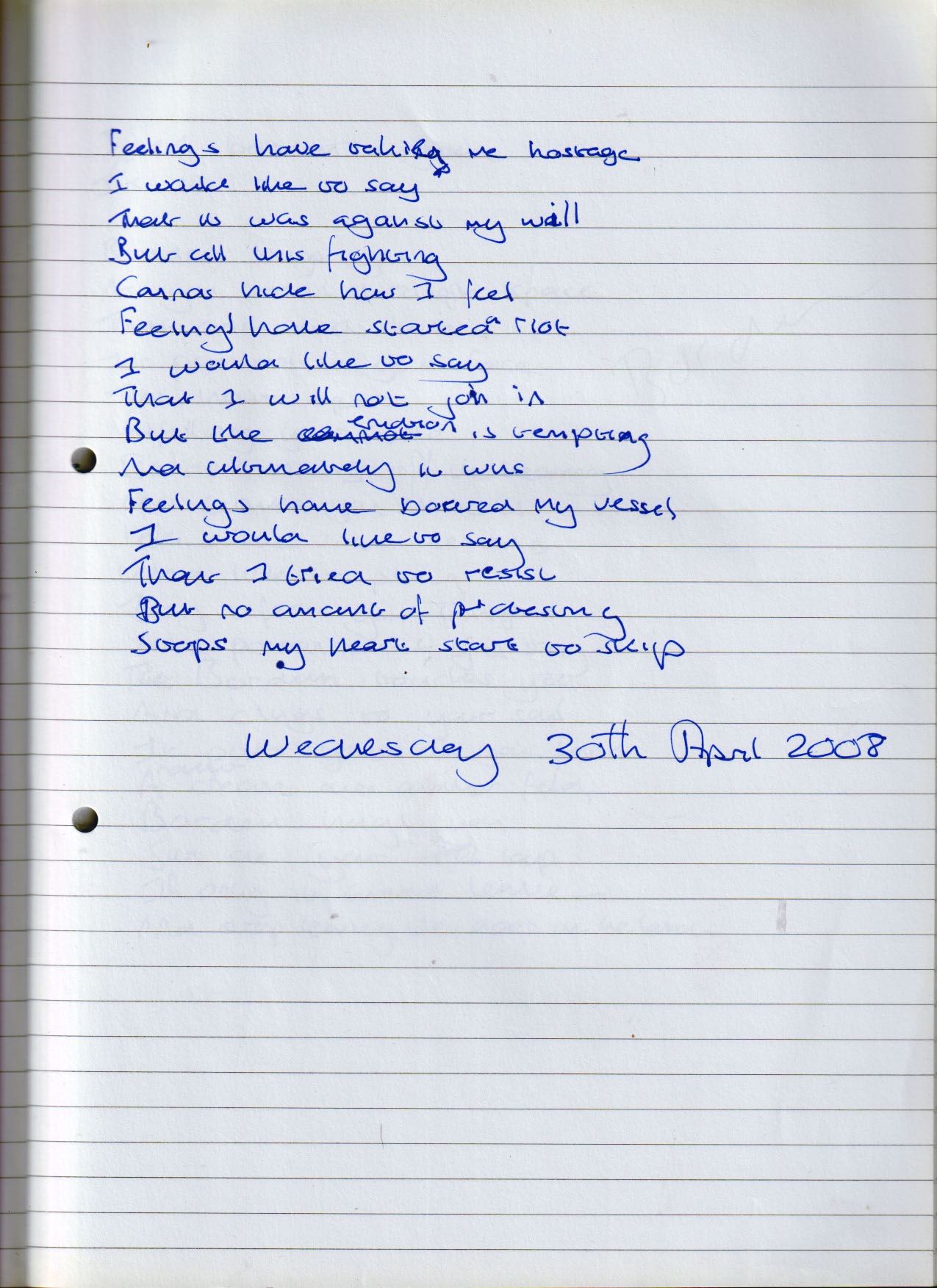 Feelings Have Taken Me Hostage – (Originally Untitled) – Wednesday 30th April 2008