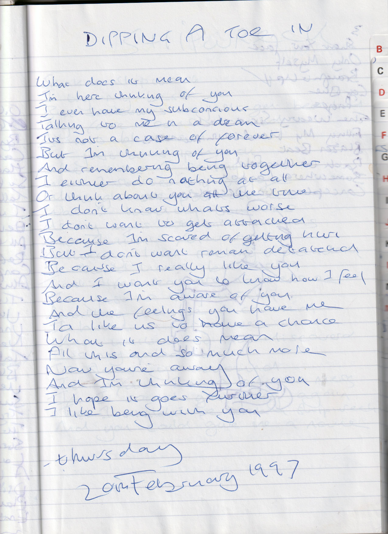 Dipping a Toe In – Thursday 20th February 1997