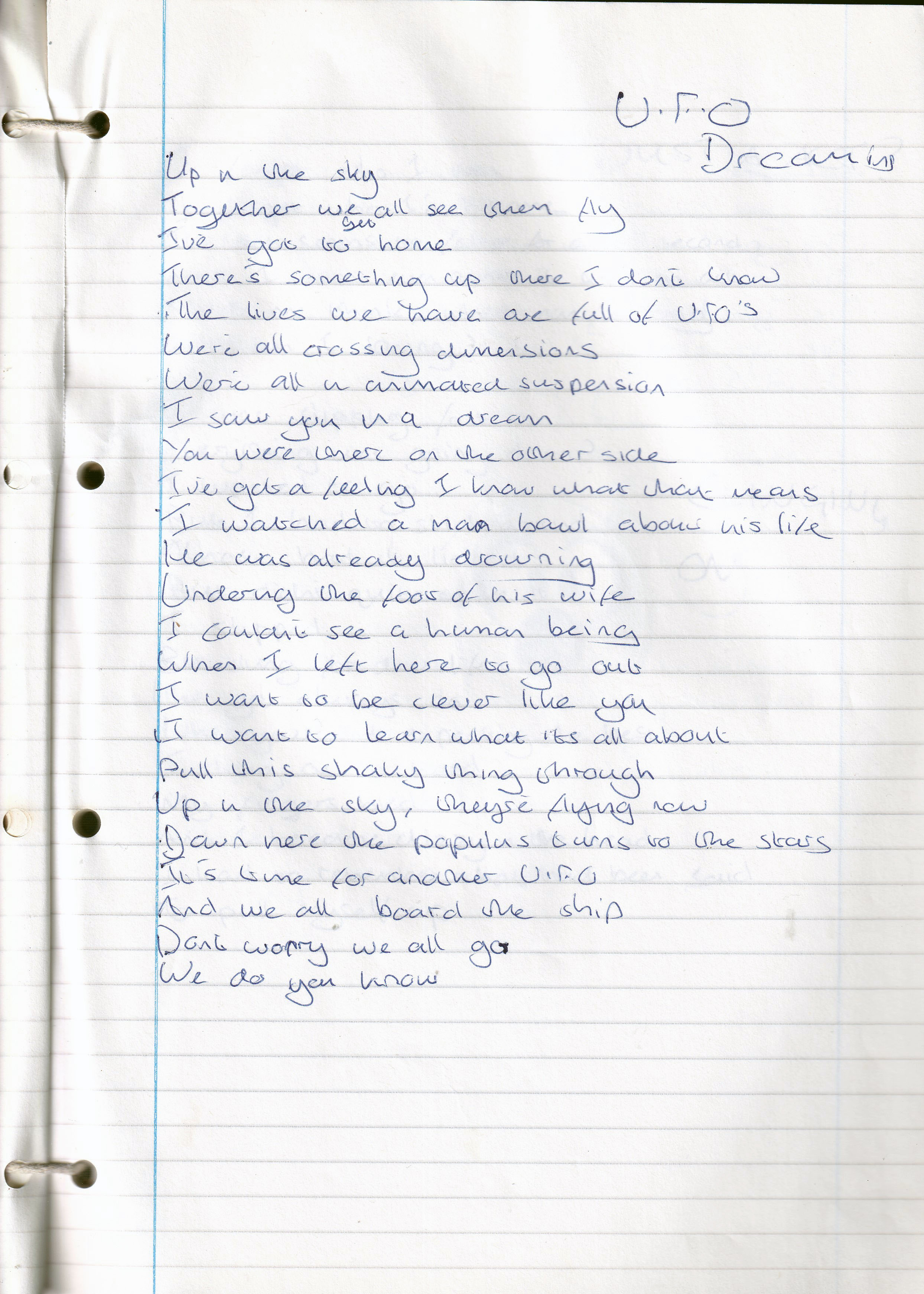 up in the sky together, we all seem to fly i have got to get home there is something up there of which i do not know the lives we have are full of U.F.O's we are all crossing dimensions we are all in animated suspension i saw you in a dream you were there on the other side i have got a feeling i know what that means i watched a man bawl about his life he was already drowning under the foot of his wife i could not see a human being when i left here to go out i want to be clever like you i want to learn what it is all about pull this shaky thing through up there, in the sky, they are flying now down here the populous turns to the stars it is time for another U.F.O and we all board the ship do not worry, we all go, we do you know