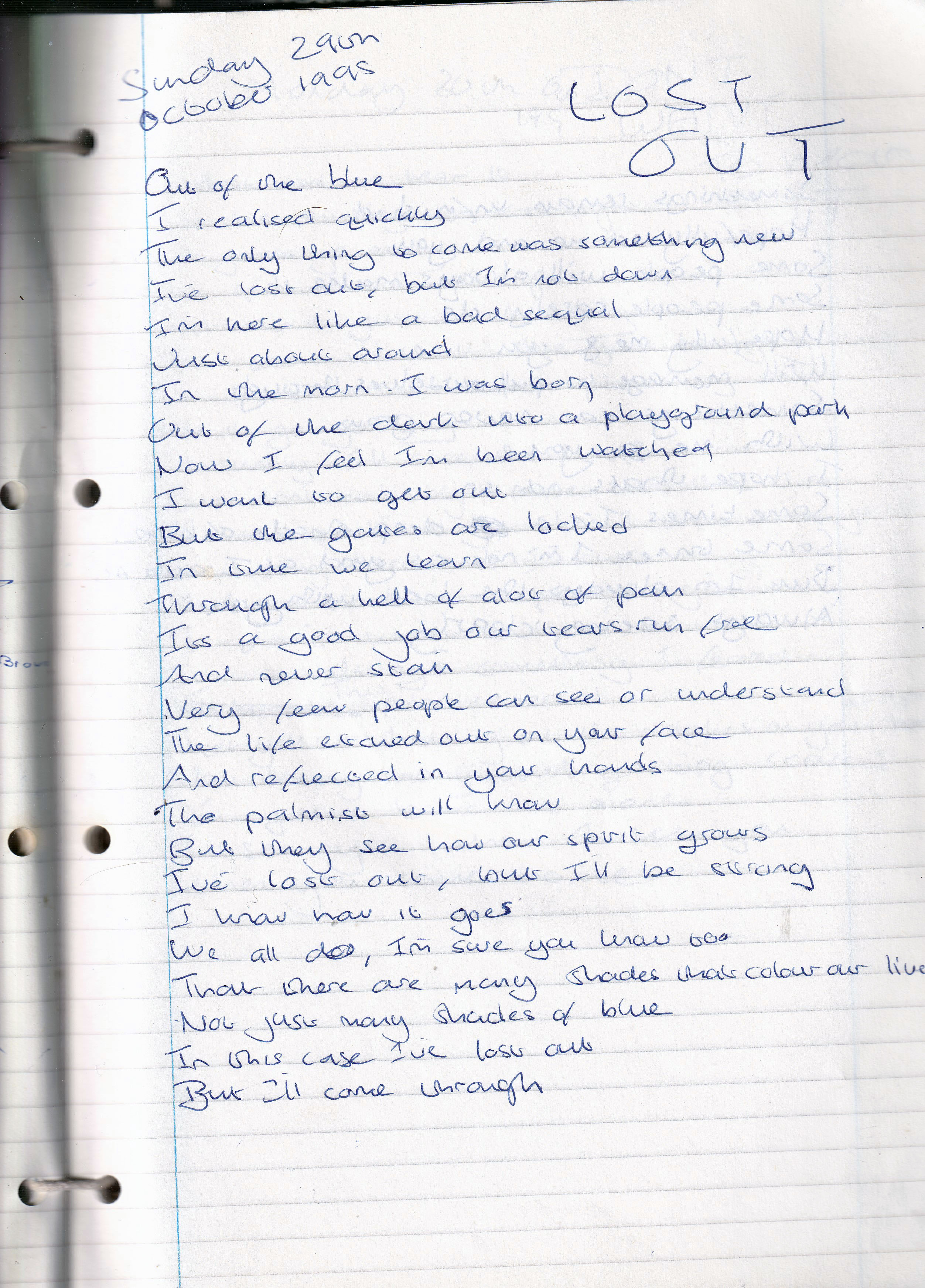 Lost Out – Written Sunday 29th October 1995 (Aged 20)