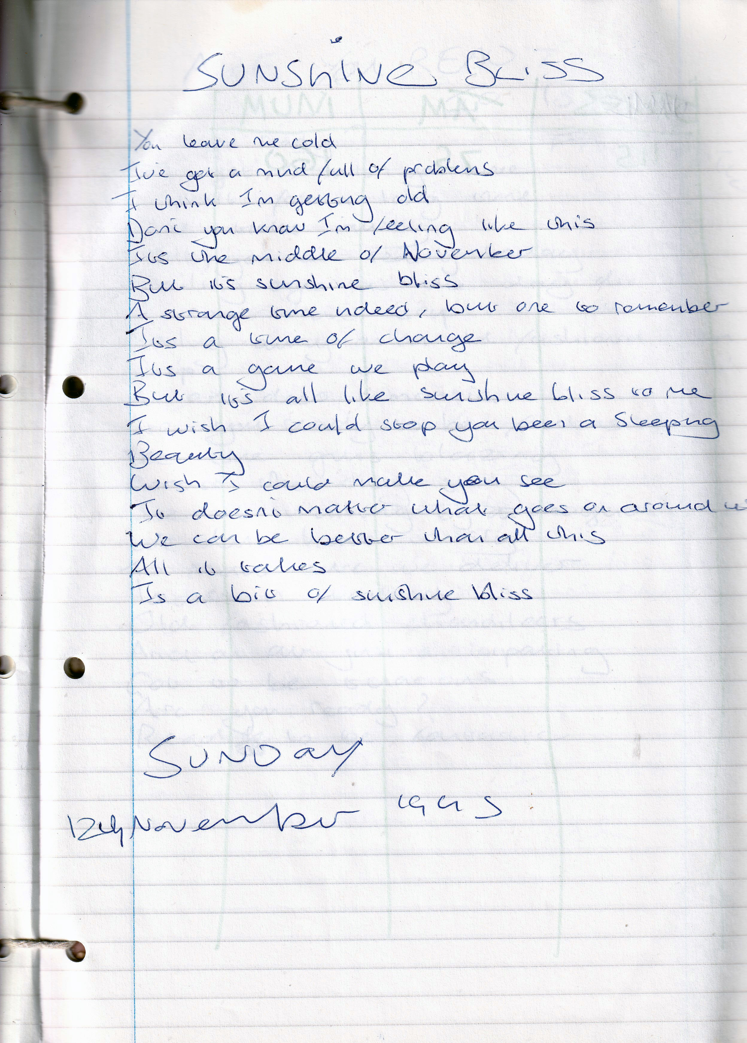 Sunshine Bliss – Written Sunday 12th November 1995 (Aged 20)