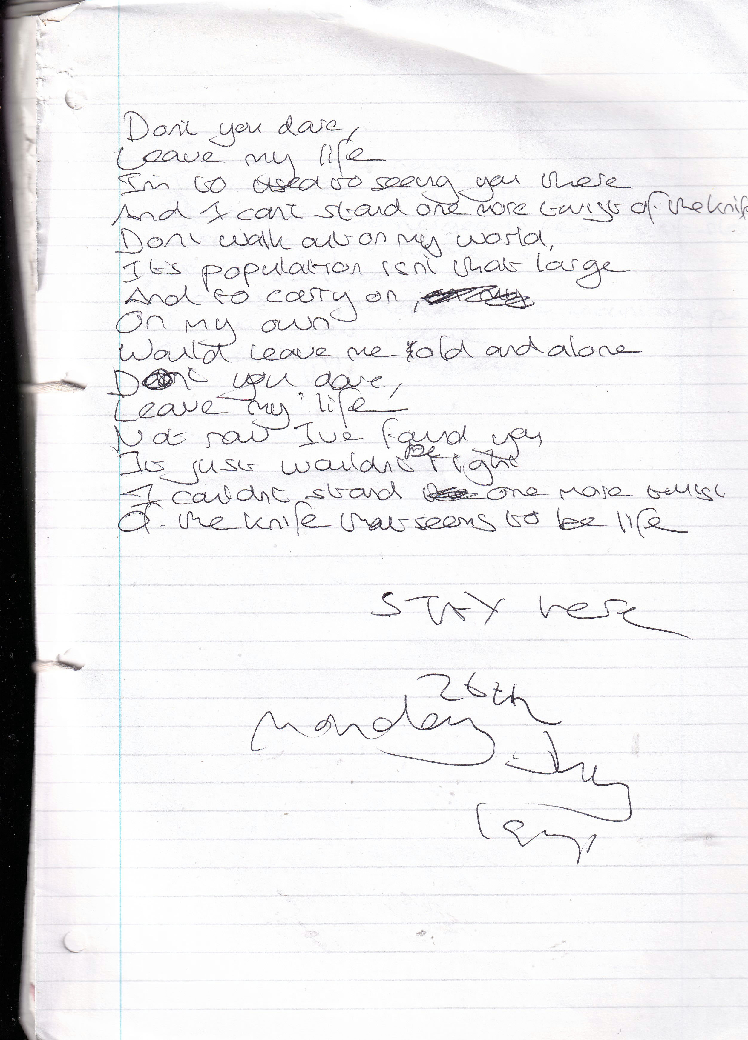 Stay Here – Written Monday 26th July 1999 (Aged 24)