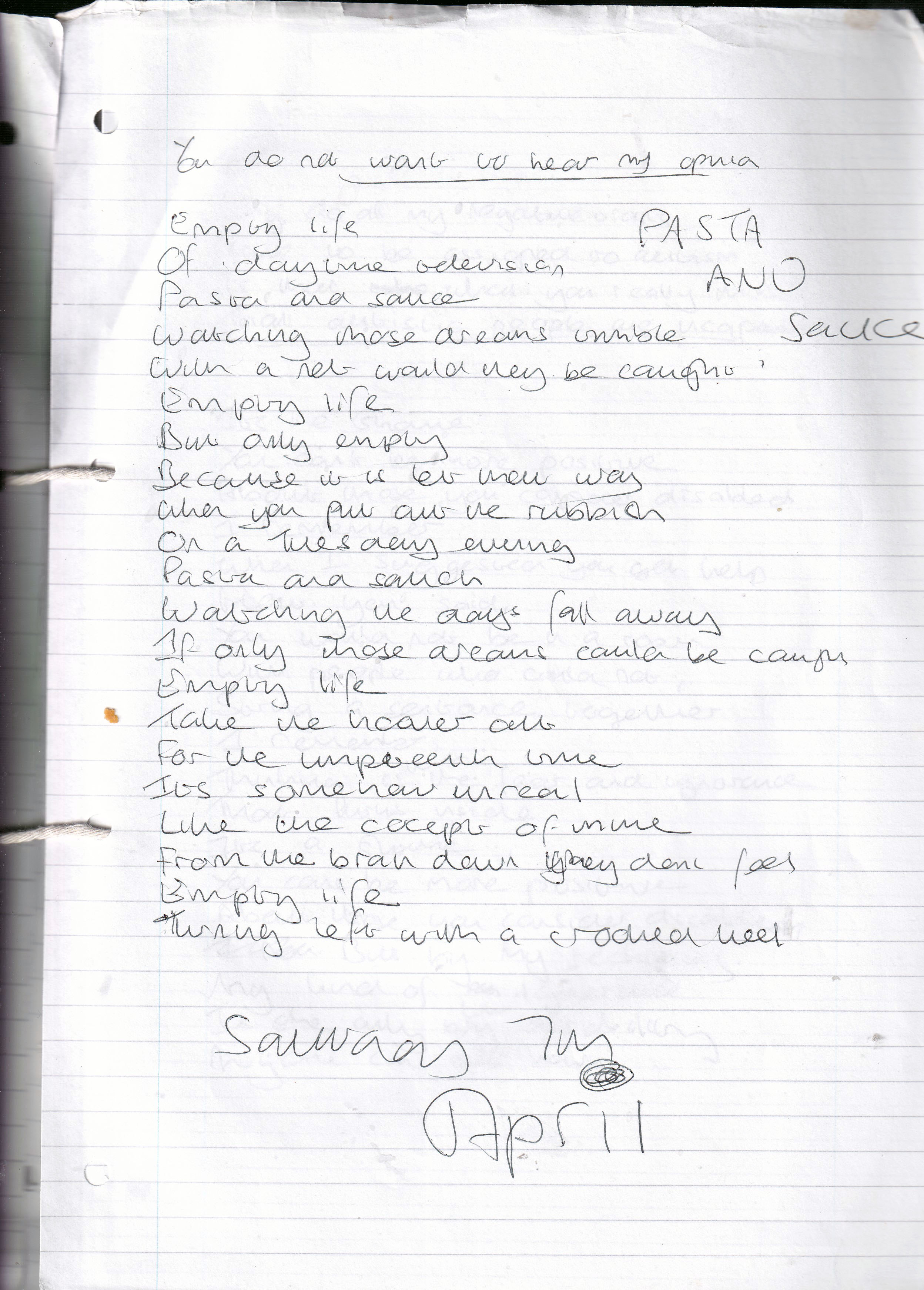 Pasta and Sauce – Written Saturday 8th April 2006 (Aged 31)