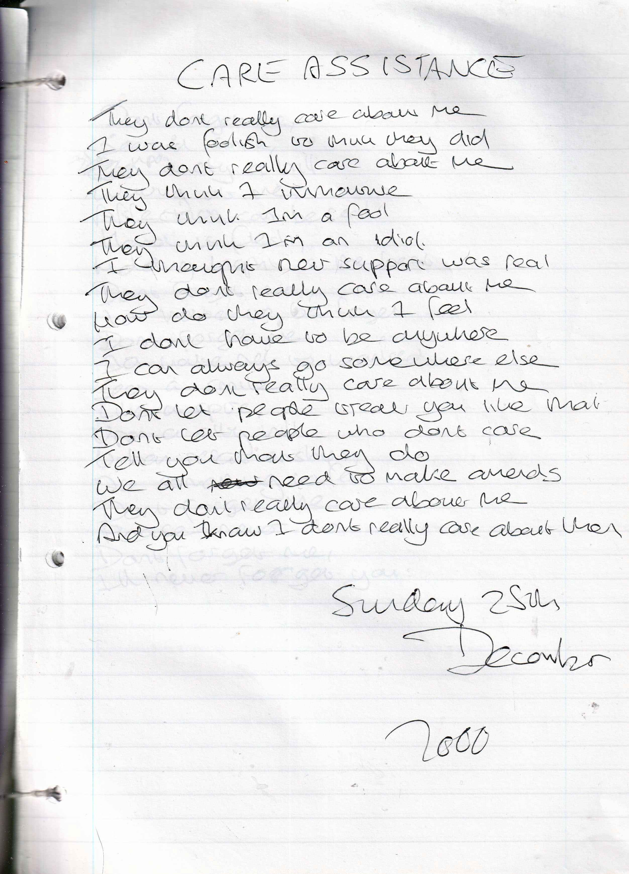 Care Assistance – Written Sunday 25th December 2000 (Aged 25)