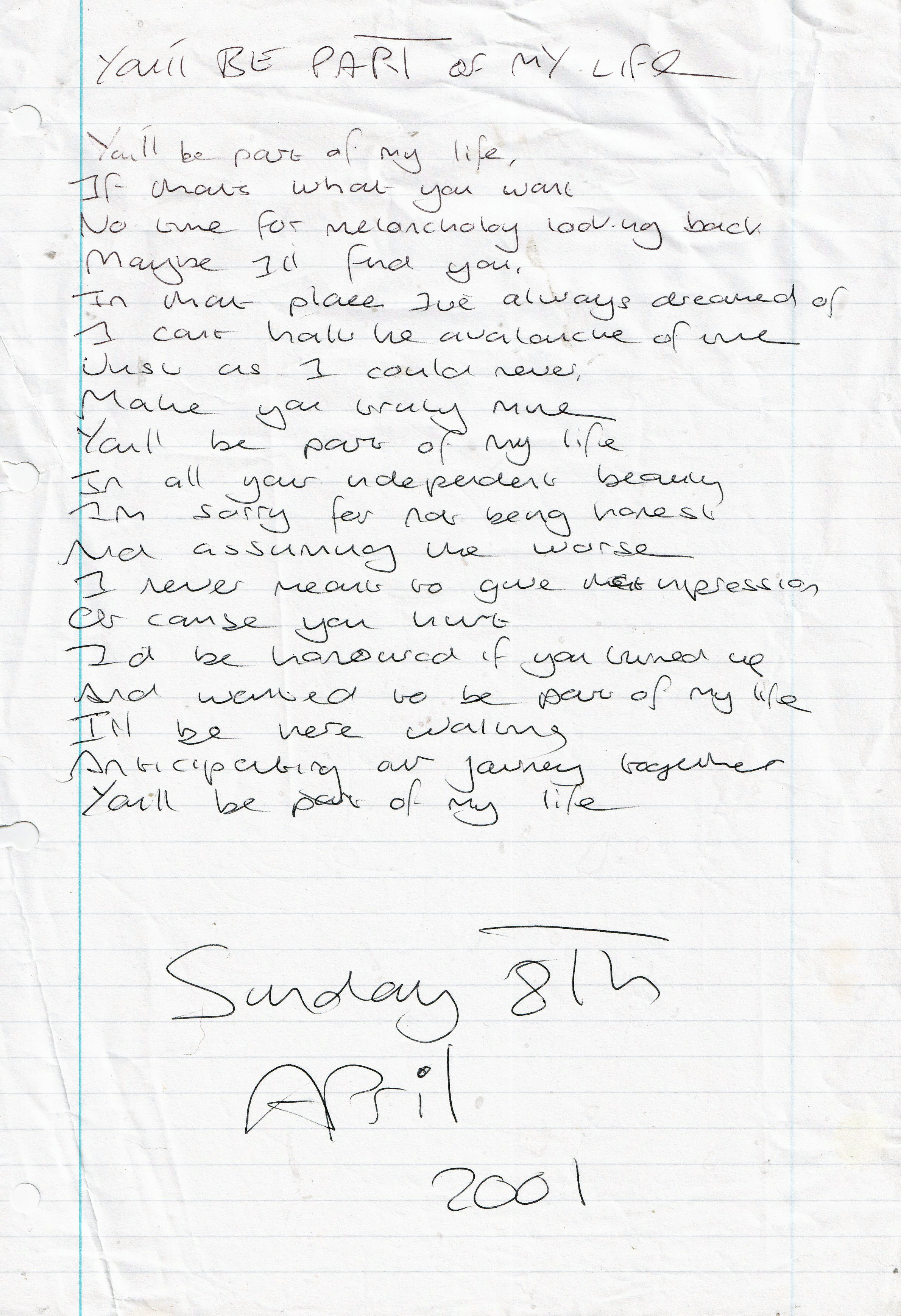 You Will Be Part of My Life – Written Sunday 8th April 2001 (Aged 26)
