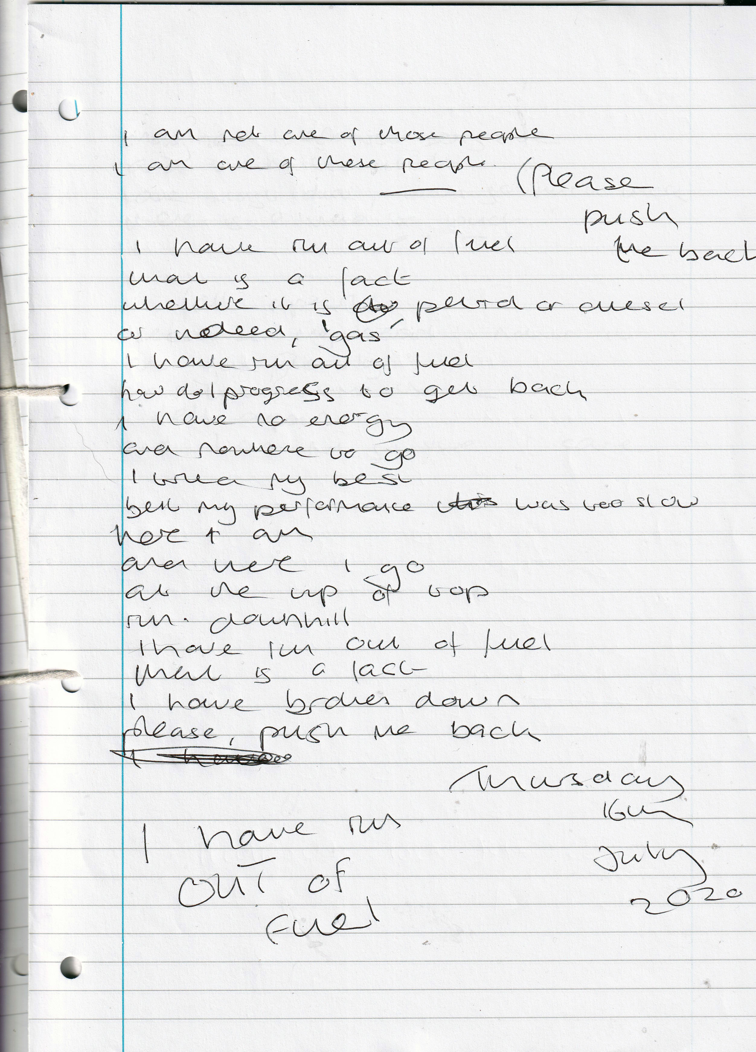 I Have Run Out of Fuel (Please Push Me Back) – Written Thursday 16th July 2020 (Aged 45)
