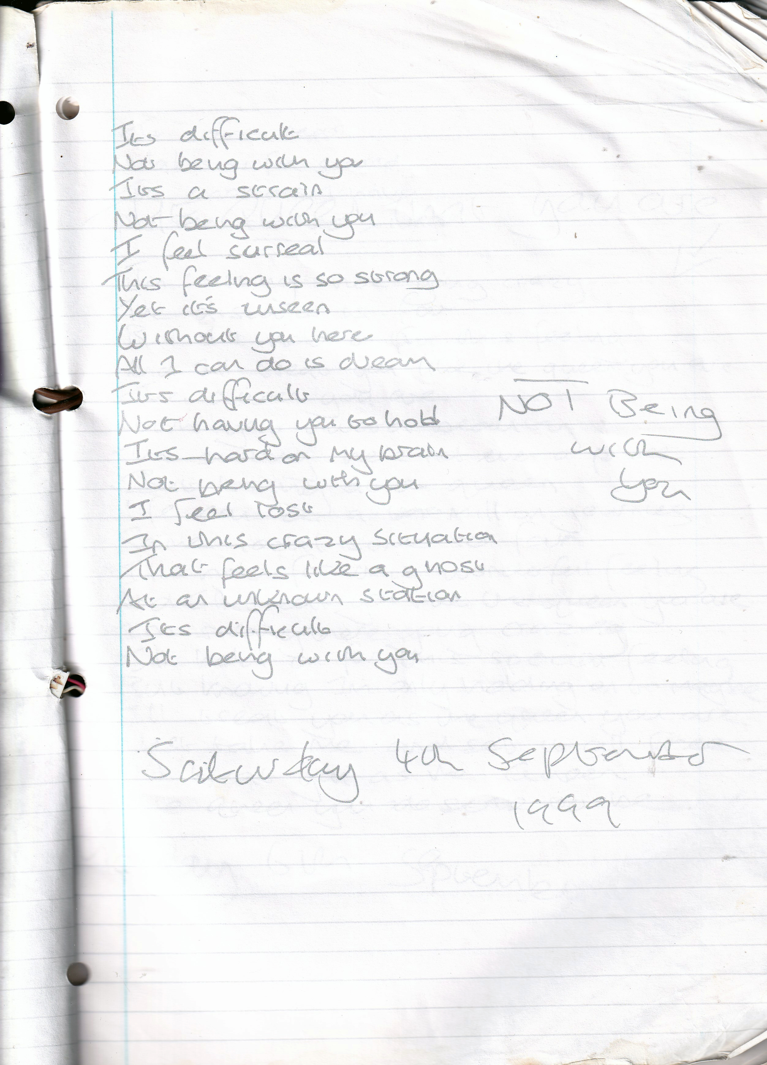 Not Being With You – Written Saturday 4th September 1999 (Aged 24)