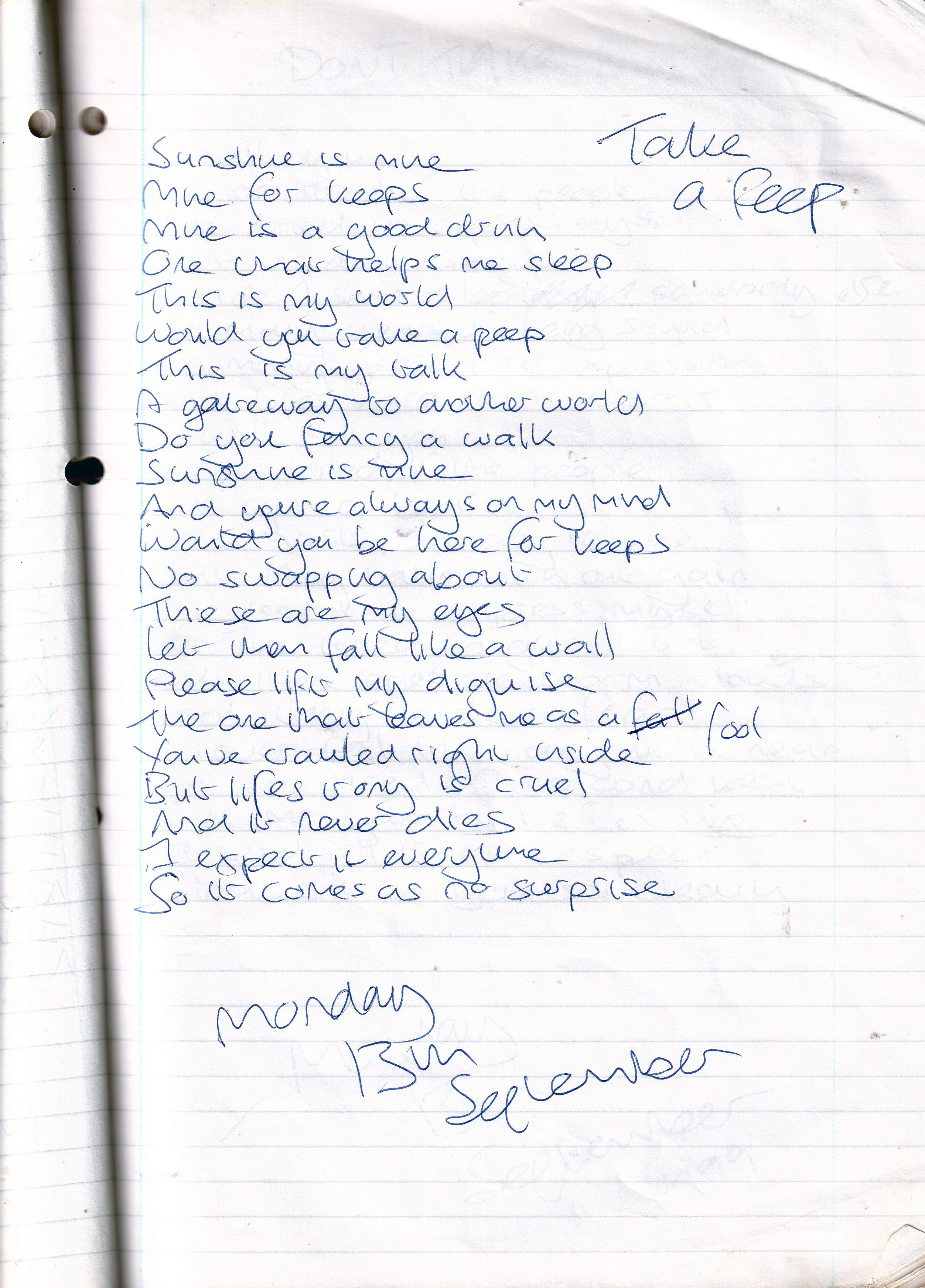Take a Peep – Written Monday 13th September 1999 (Aged 24)