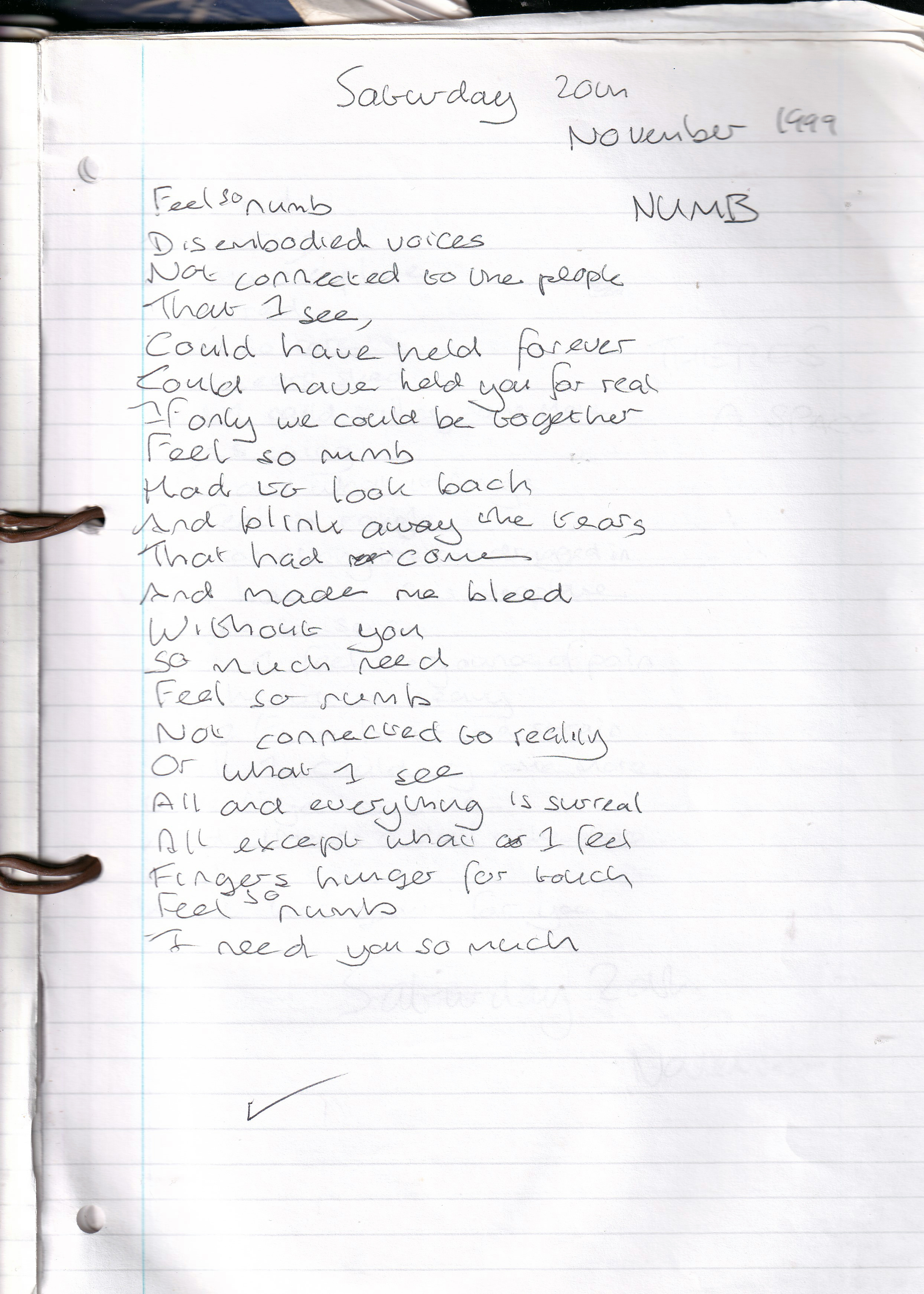 Feel Numb – Written Saturday 20th November 1999 (Aged 24)