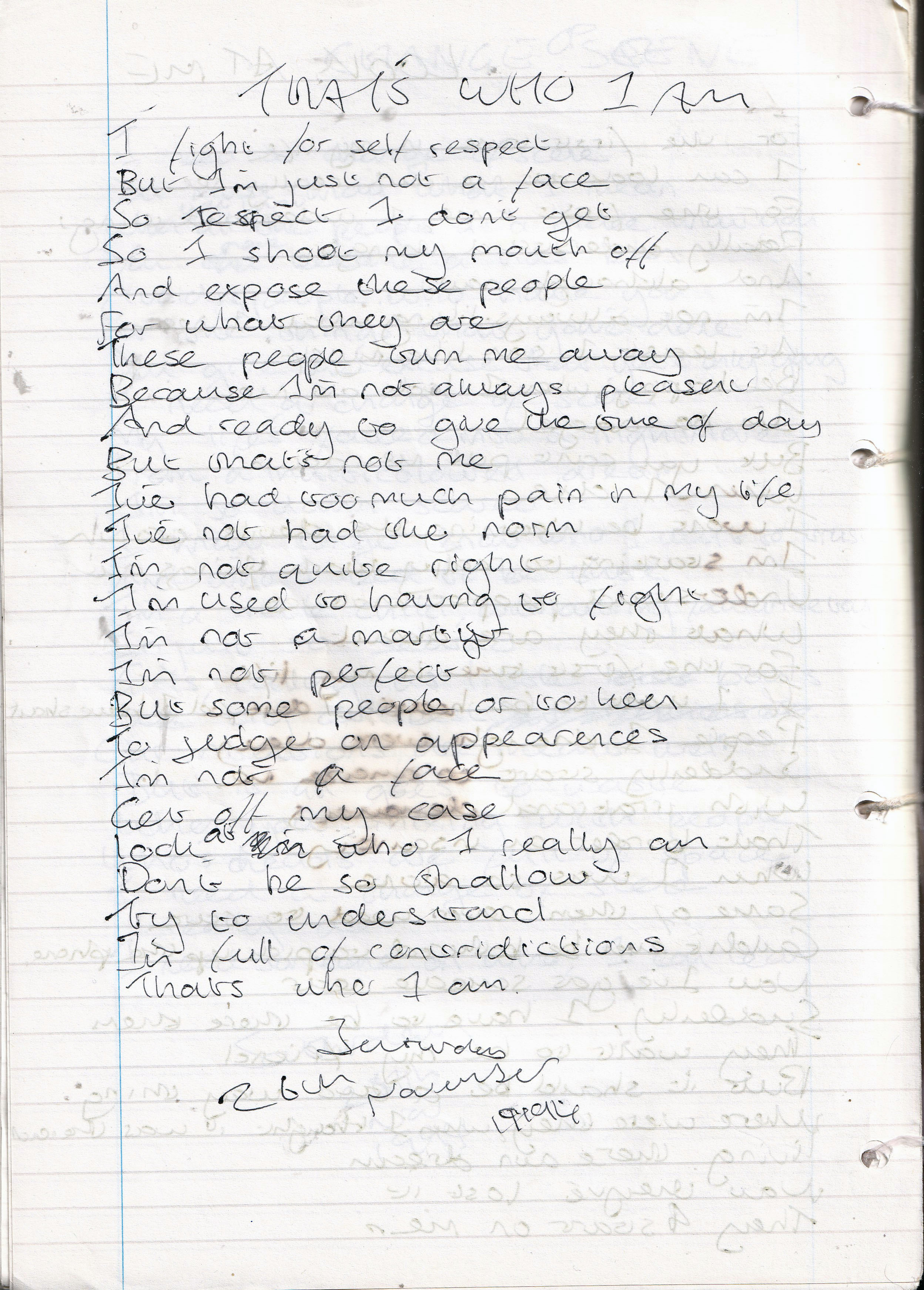 That’s Who I Am i fight for self respect but i am just not a face so respect, i never get so i shoot my mouth off and expose these people for what they are these people turn me away because i am not always pleasant and ready to give them – the time of day but that is not me i’ve had too much pain in my life i have not had the norm and i am not quite right i am used to having to fight i am not a martyr i am not perfect but some people are too keen to judge on appearances i am not a face, get off my case look at who i really am do not be so shallow and always try to understand i am full of contradictions that is who i am James Garratt – Saturday 26th November 1994 More poems at https://theboybehindtheglasses.com/ More about this blog, The Boy Behind the Glasses, here
