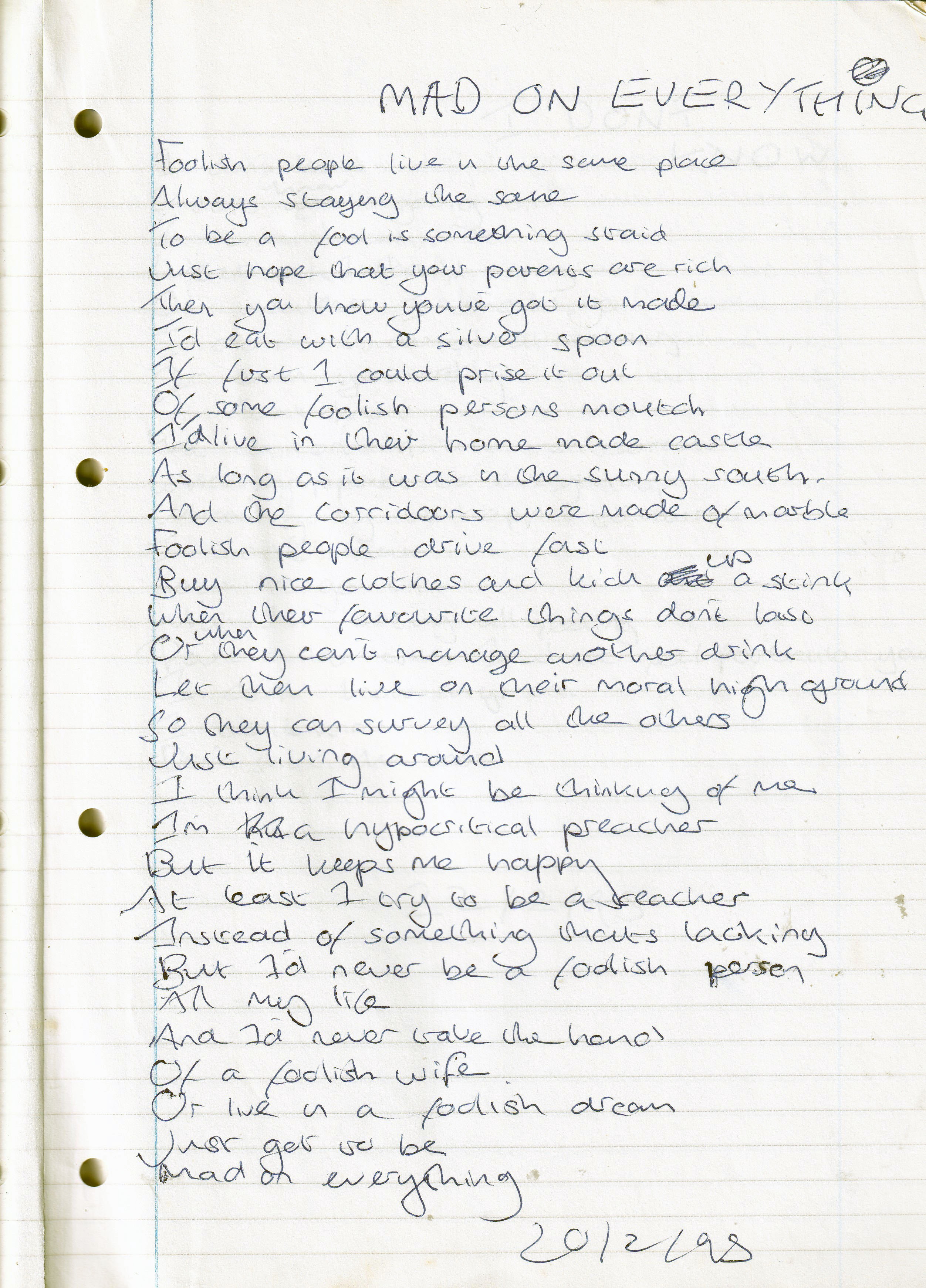 Mad on Everything – Written Monday 20th February 1995 (Aged 19)