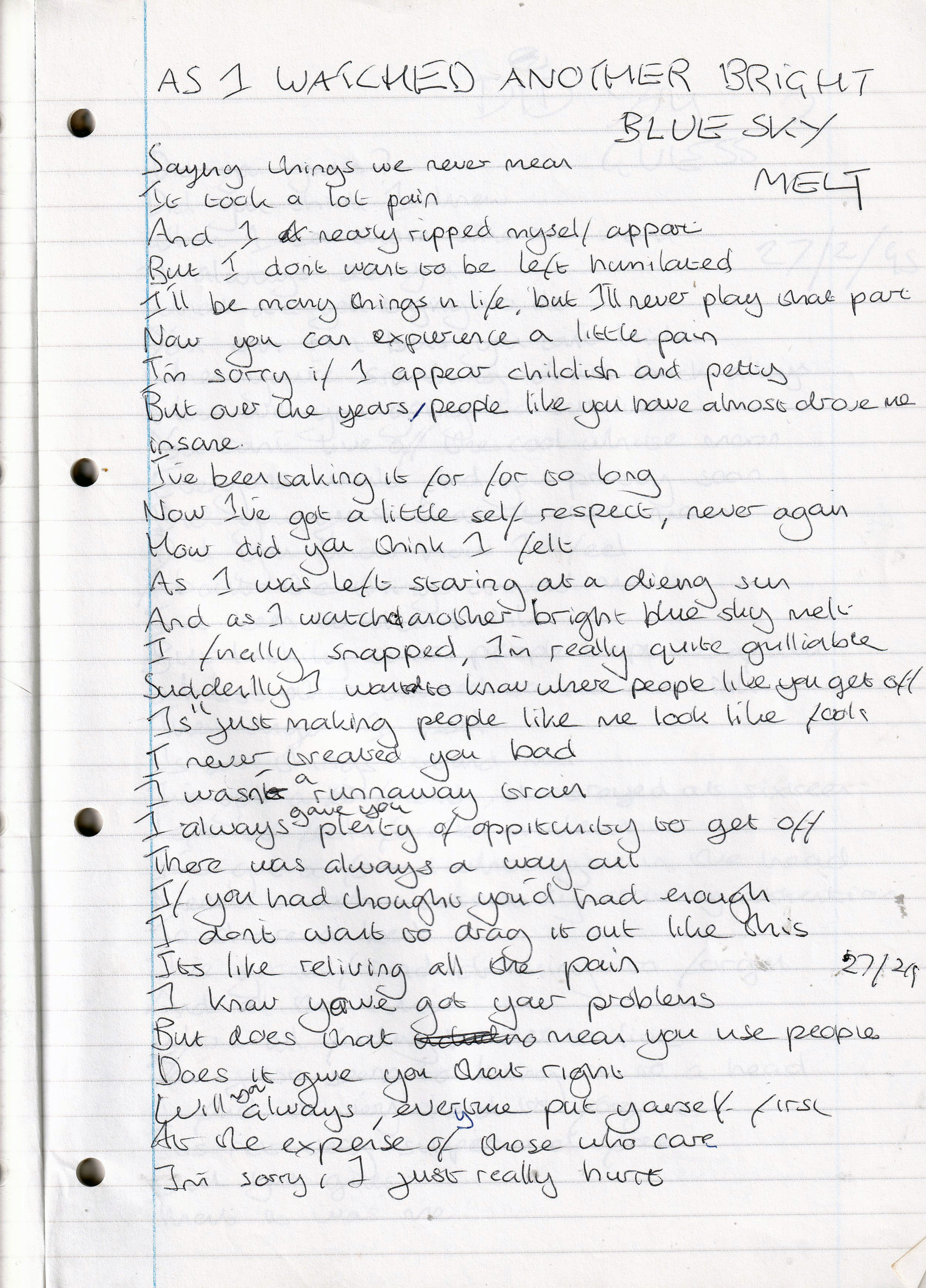 As I Watched Another Bright Blue Sky Melt – Written Monday 27th February 1995 (Aged 20)