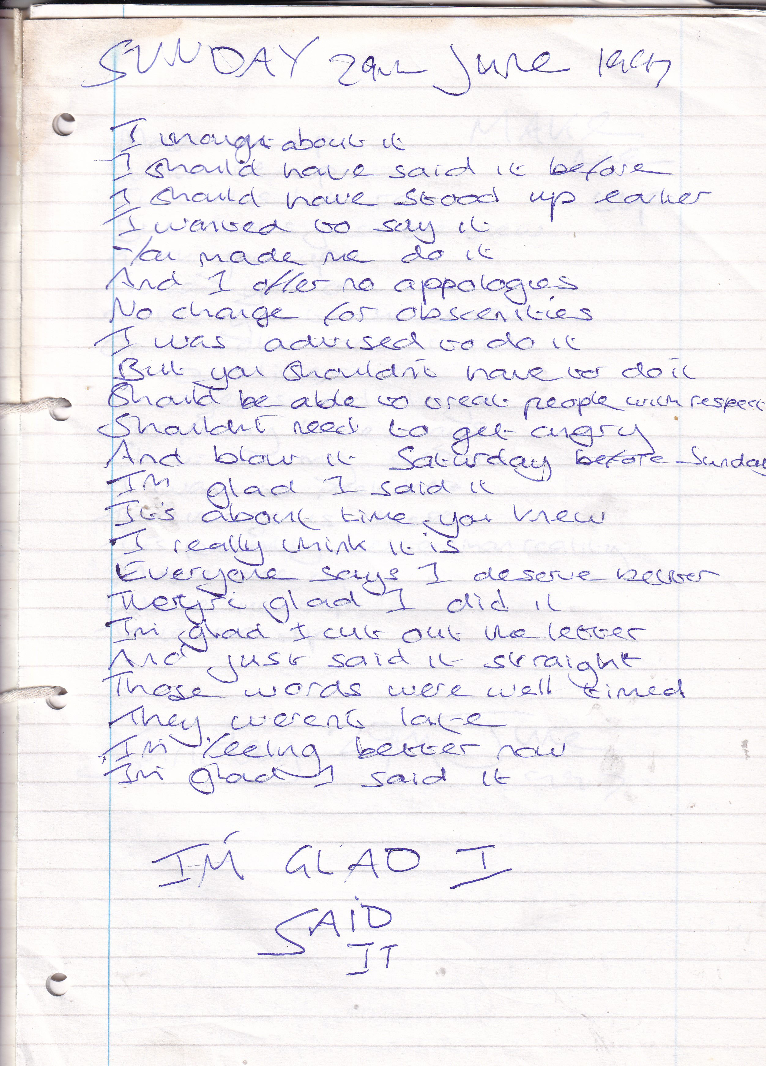 I Am Glad I Said It – Written Sunday 29th June 1997 (Aged 22)