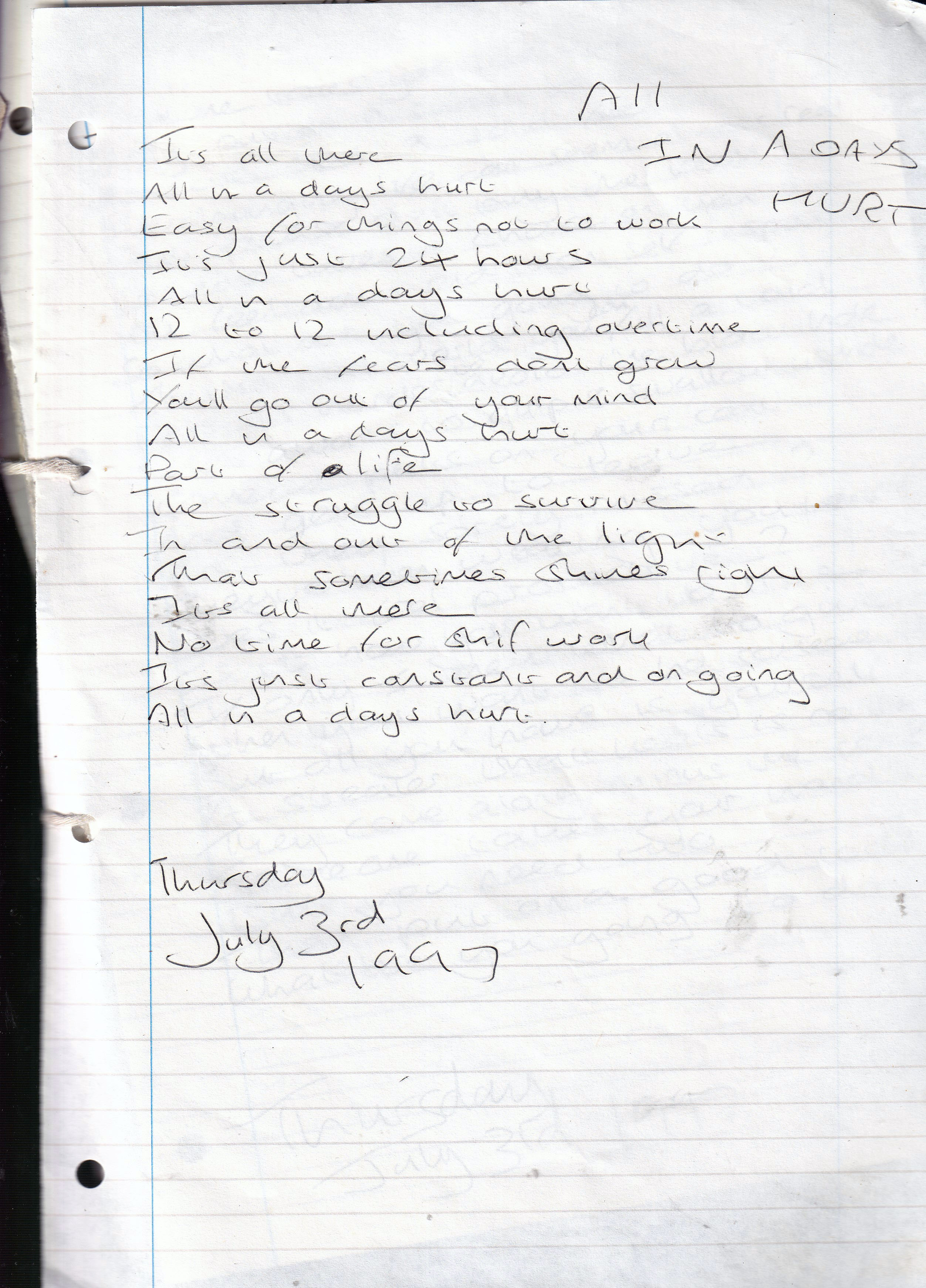 All In a Days Hurt – Written Thursday 3rd July 1997 (Aged 22)