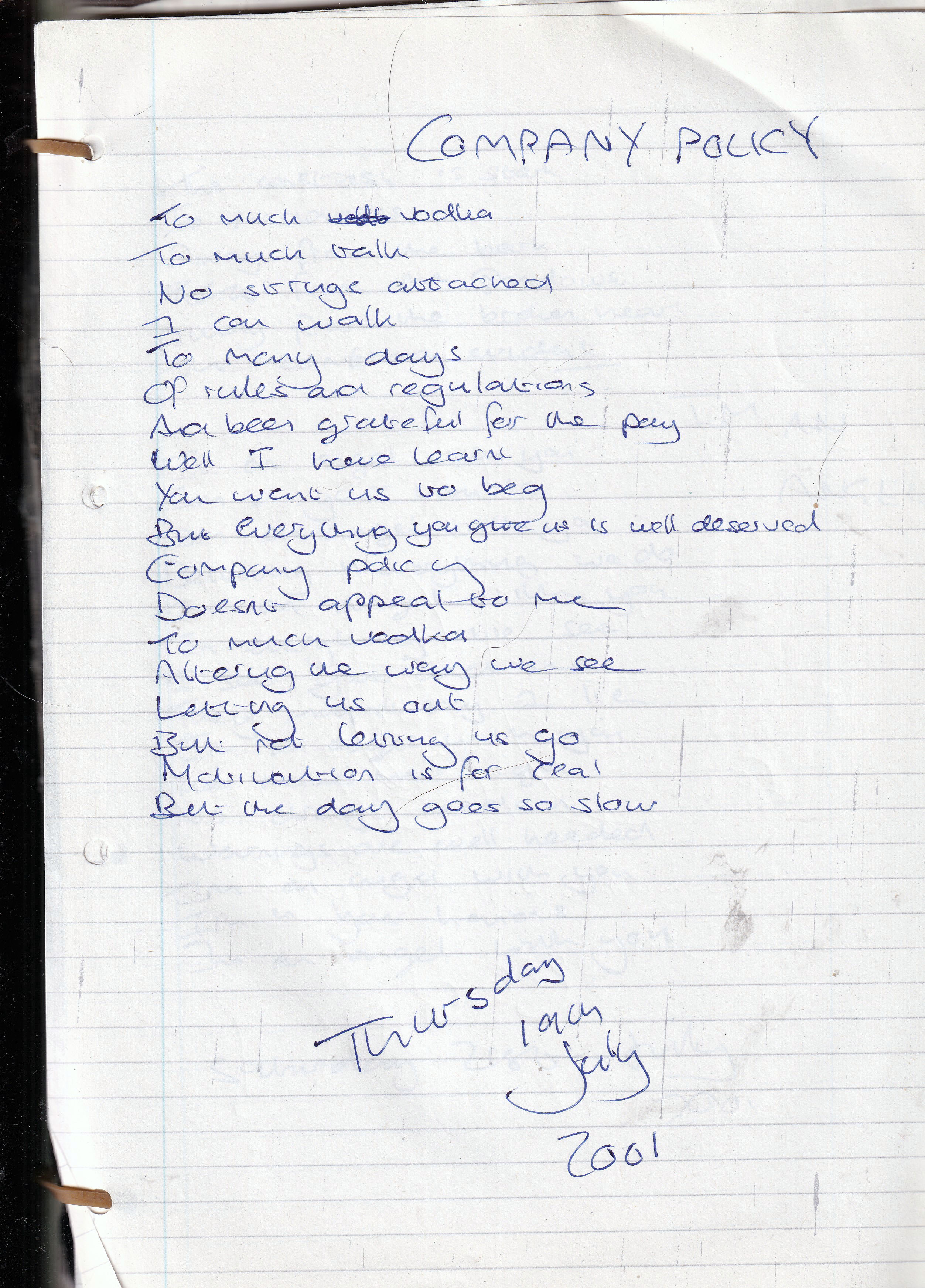 Company Policy – Written Thursday 19th July 2001 (Aged 26)