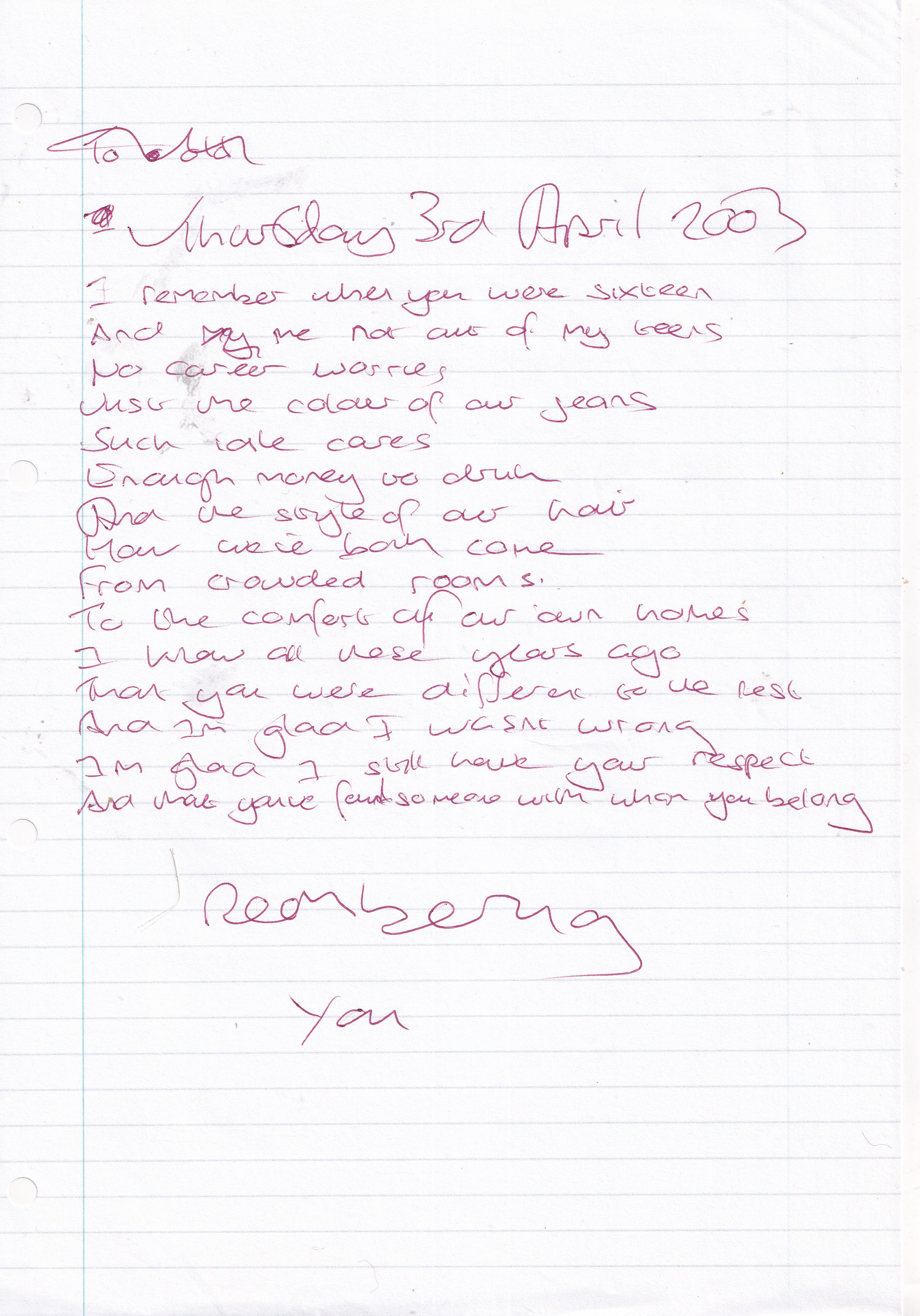Remembering You – Written Thursday 3rd April 2003 (Aged 28)