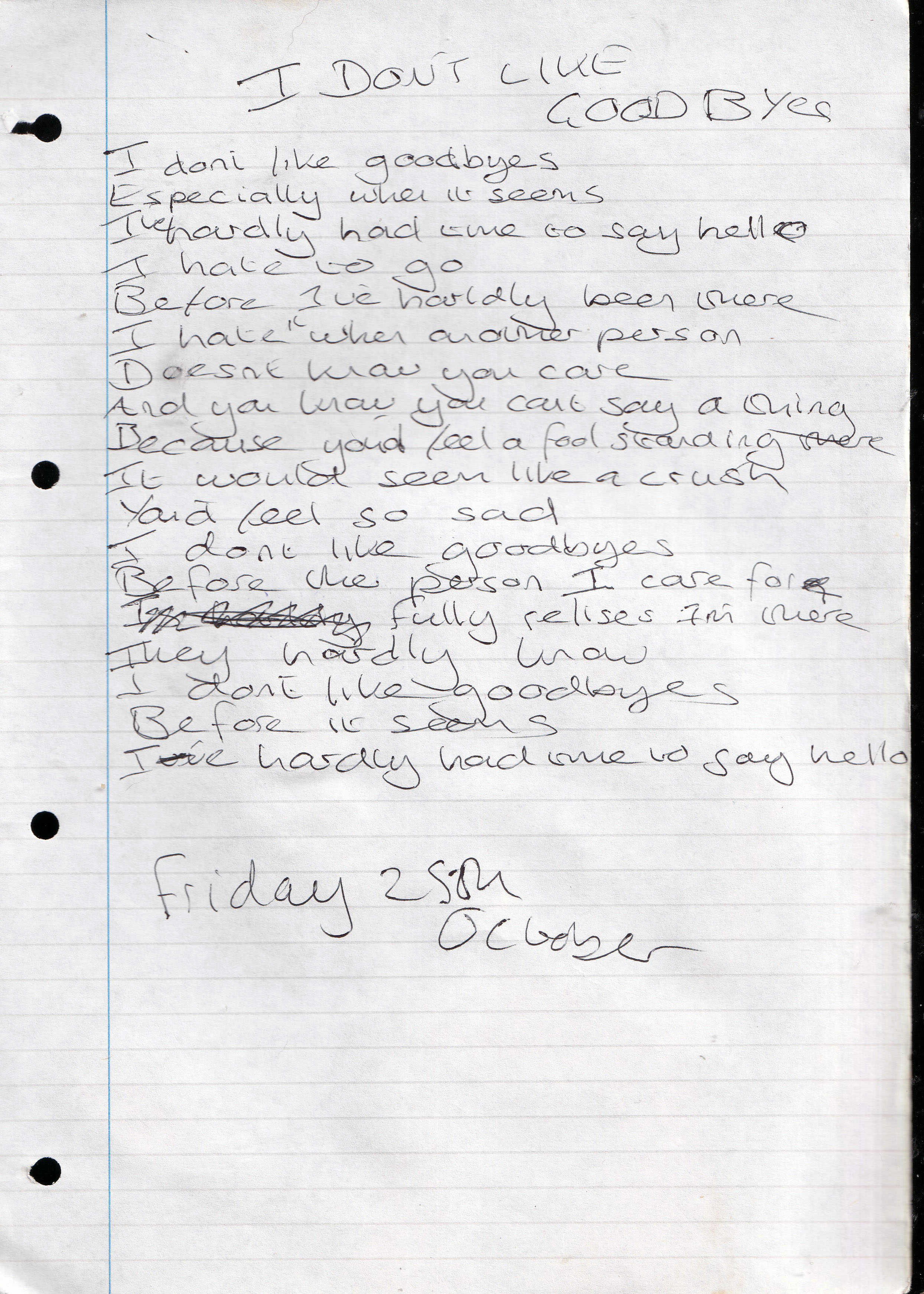 I Don’t Like Goodbyes – Written Friday 25th October 1997 (Aged 22)