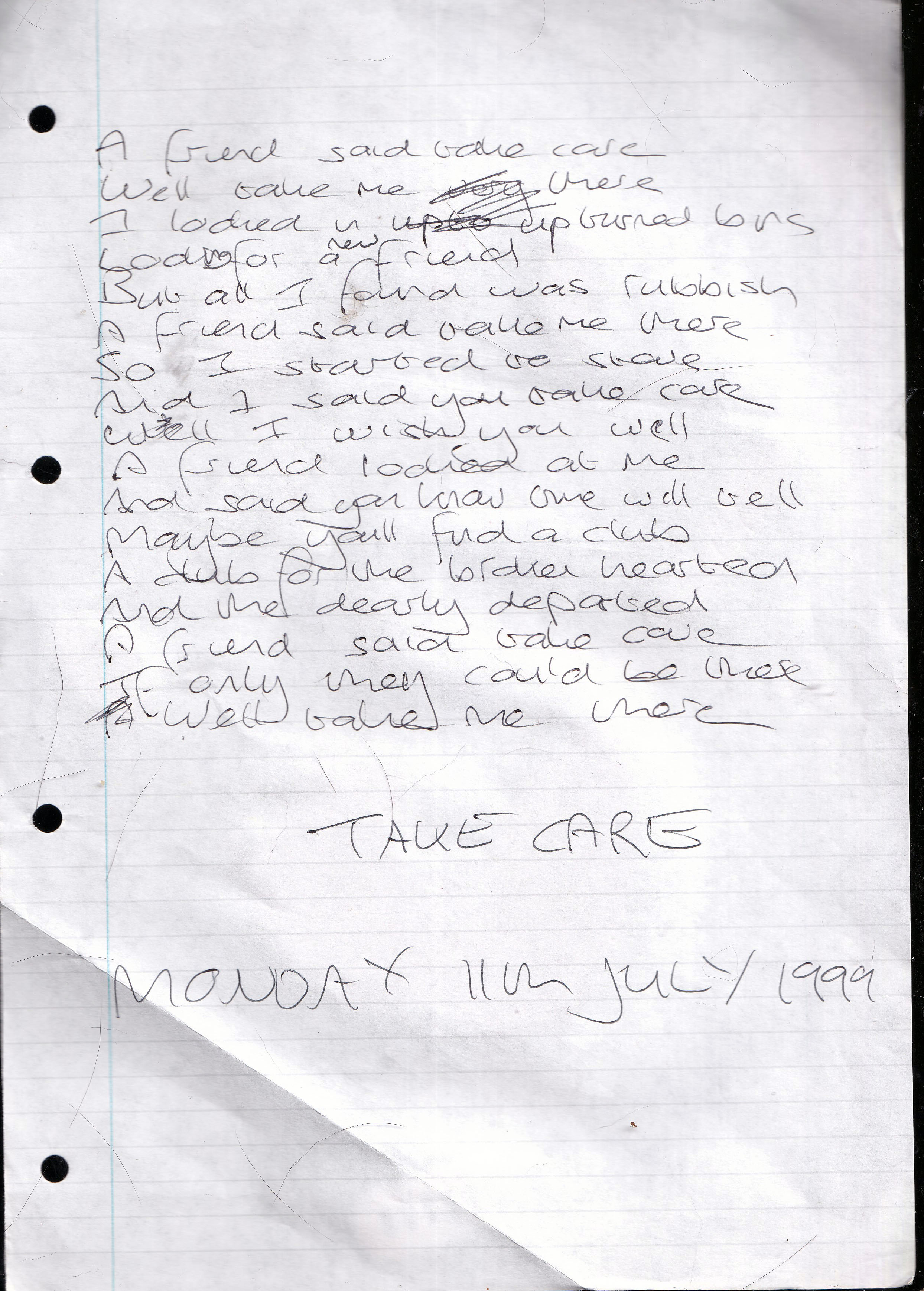 Take Care – Written Monday 11th July 1999 (Aged 24)