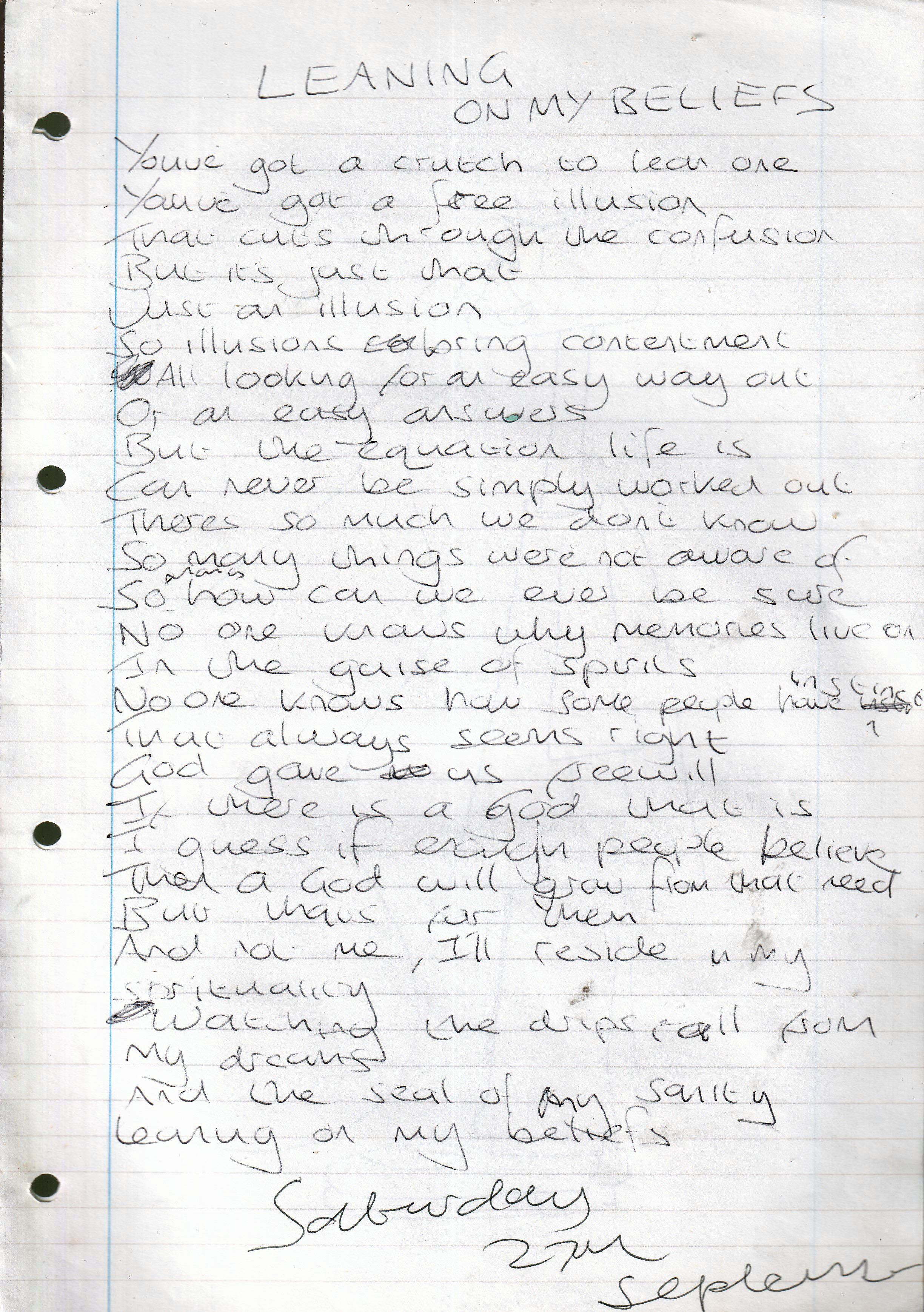 Leaning On My Beliefs – Written Saturday 27th September 1997 (Aged 22)
