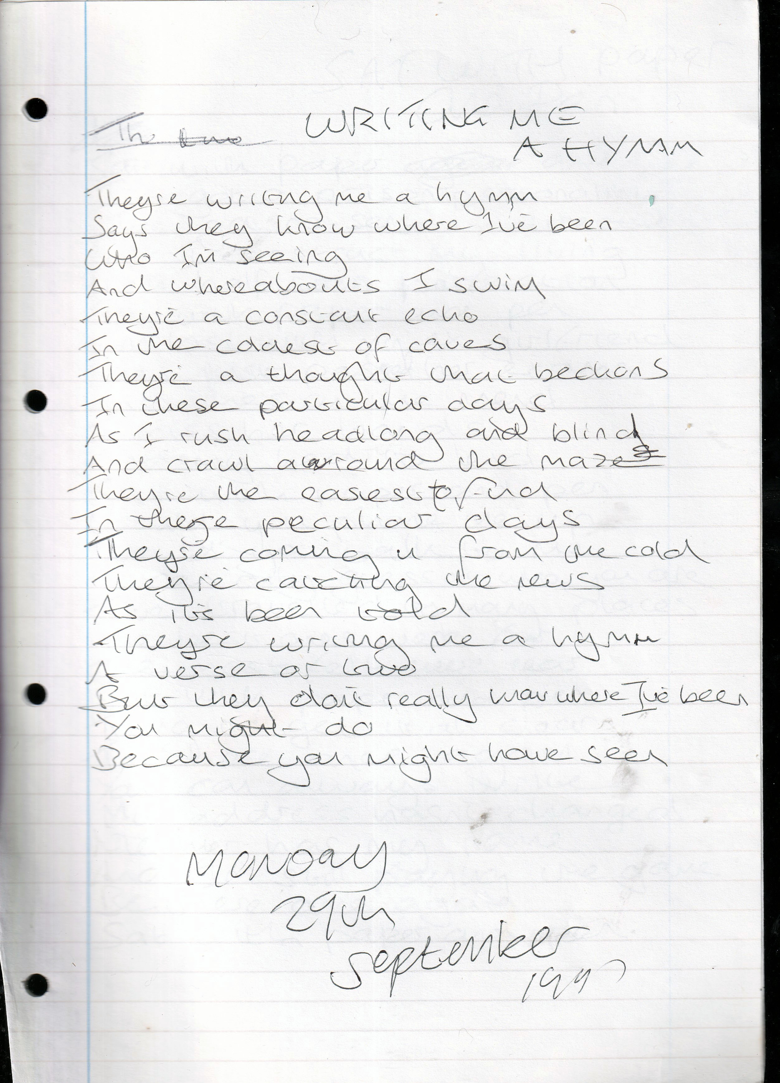 Writing Me A Hymn – Written Monday 29th September 1997 (Aged 22)