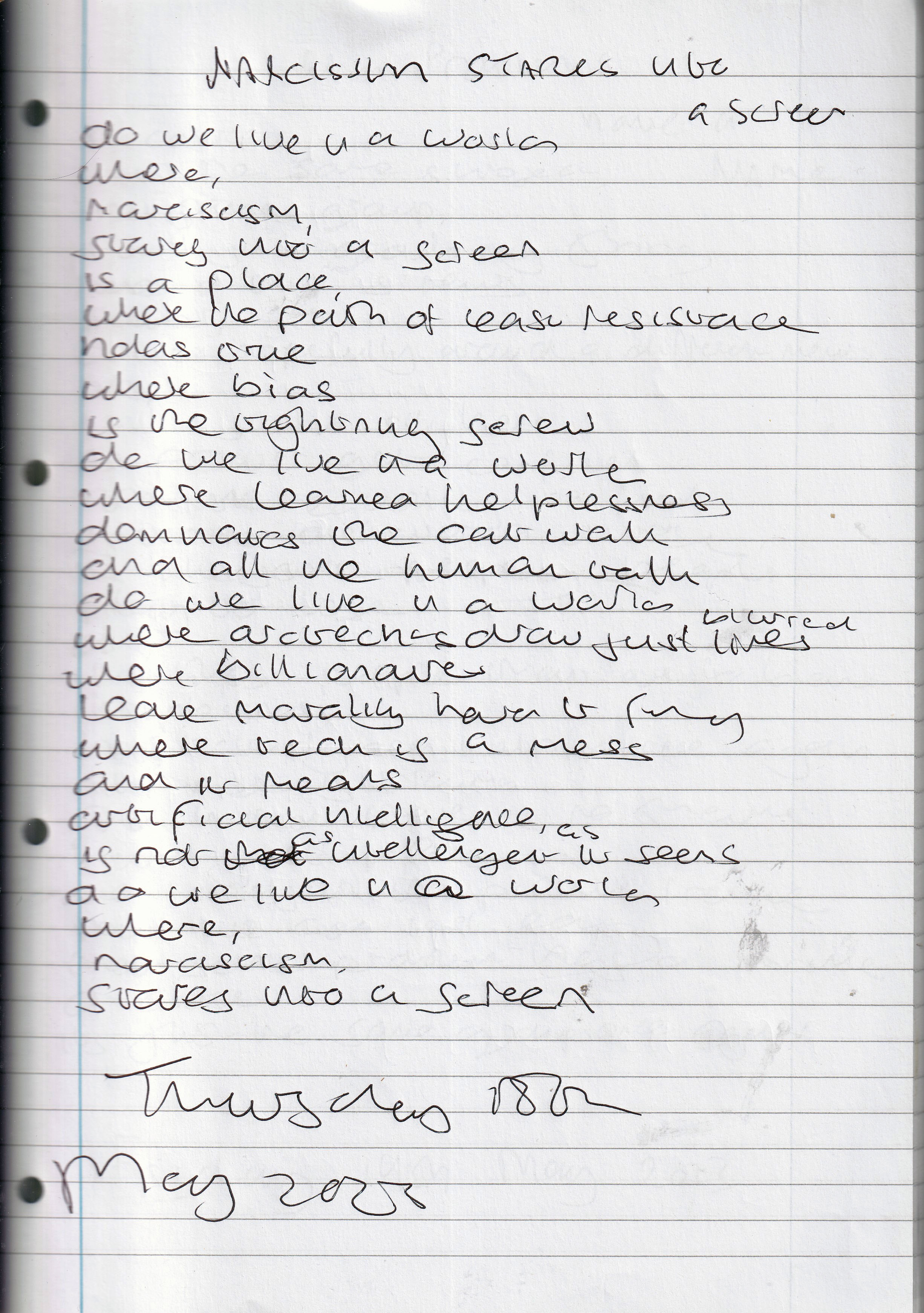 Narcissism Stares Into a Screen – Written Thursday 18th May 2023 (Aged 48)