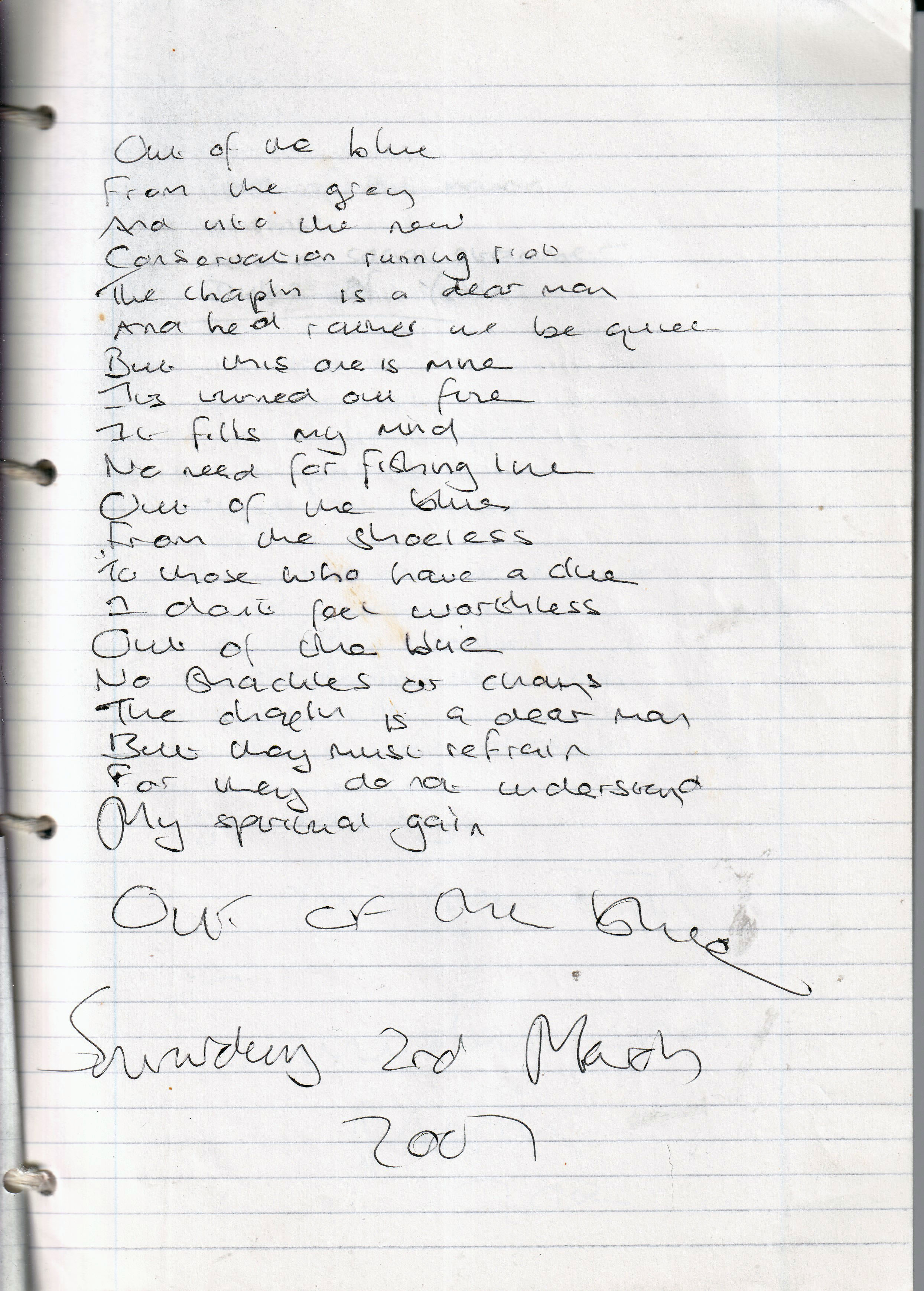 Out of The Blue – Written Saturday 2nd March 2002 (Aged 27)