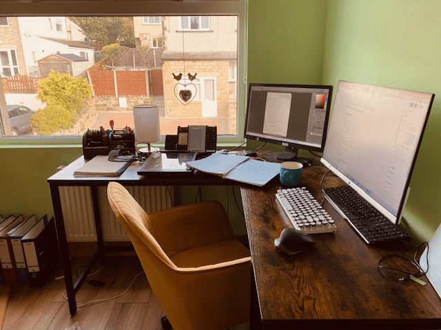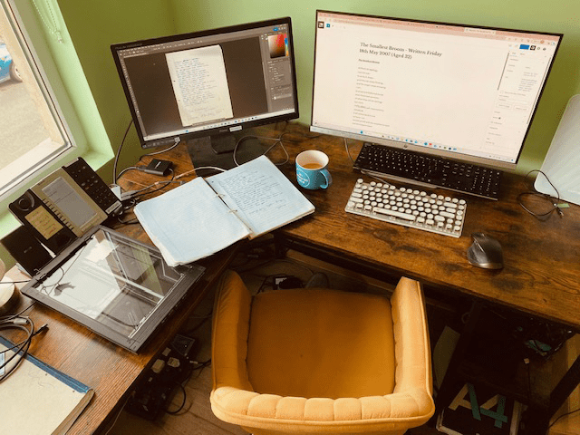 Talking of a big push, part of that was on Monday. Since COVID we’ve all worked more than home and like a lot of people we have a home working set up. Usually it’s my wife or myself working but on Monday my wife wasn’t working at home and I had a day off. I’ve also just got a new laptop, the third since 2019! I’ve been using my spare for the last year and it’s really past it’s best. On Monday I set up the new laptop which is lovely by the way with our home working setup, and I spent the day getting through as much writing as I could. It really helps having the two monitor setup. If you look closely you’ll also notice the scanner, it’s still working, despite no longer having the lid attached! Just to go over this setup, it’s quite simple. The poem is typed up into WordPress then the original is scanned into Photoshop. I do a small amount of tidying on photoshop to fix colour balances and enhance any faded writing. Then it’s added back into WordPress.