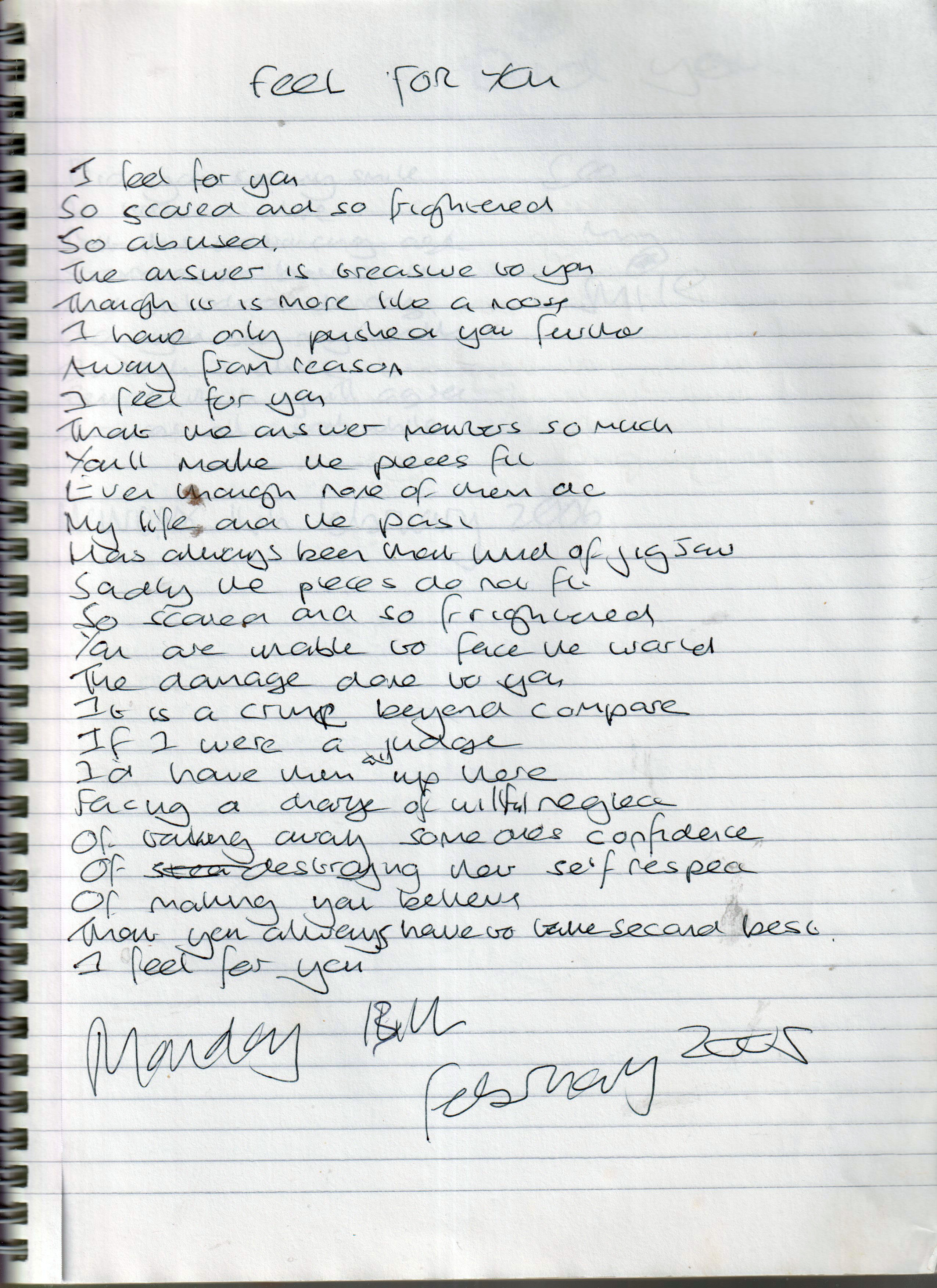Feel For You – Written Monday 13th February 2006 (Aged 30)