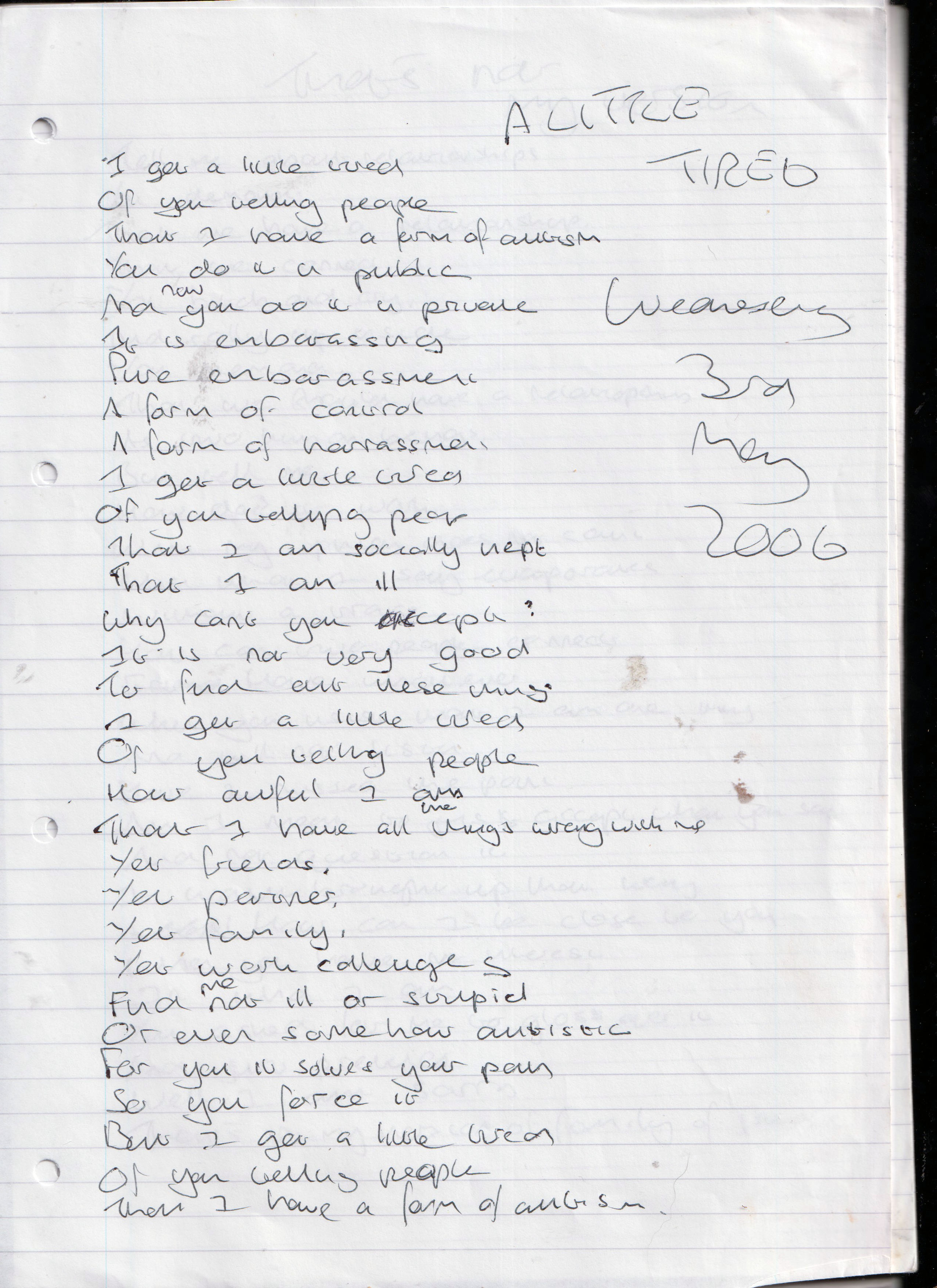 A Little Tired – Written Wednesday 3rd May 2006 (Aged 31)