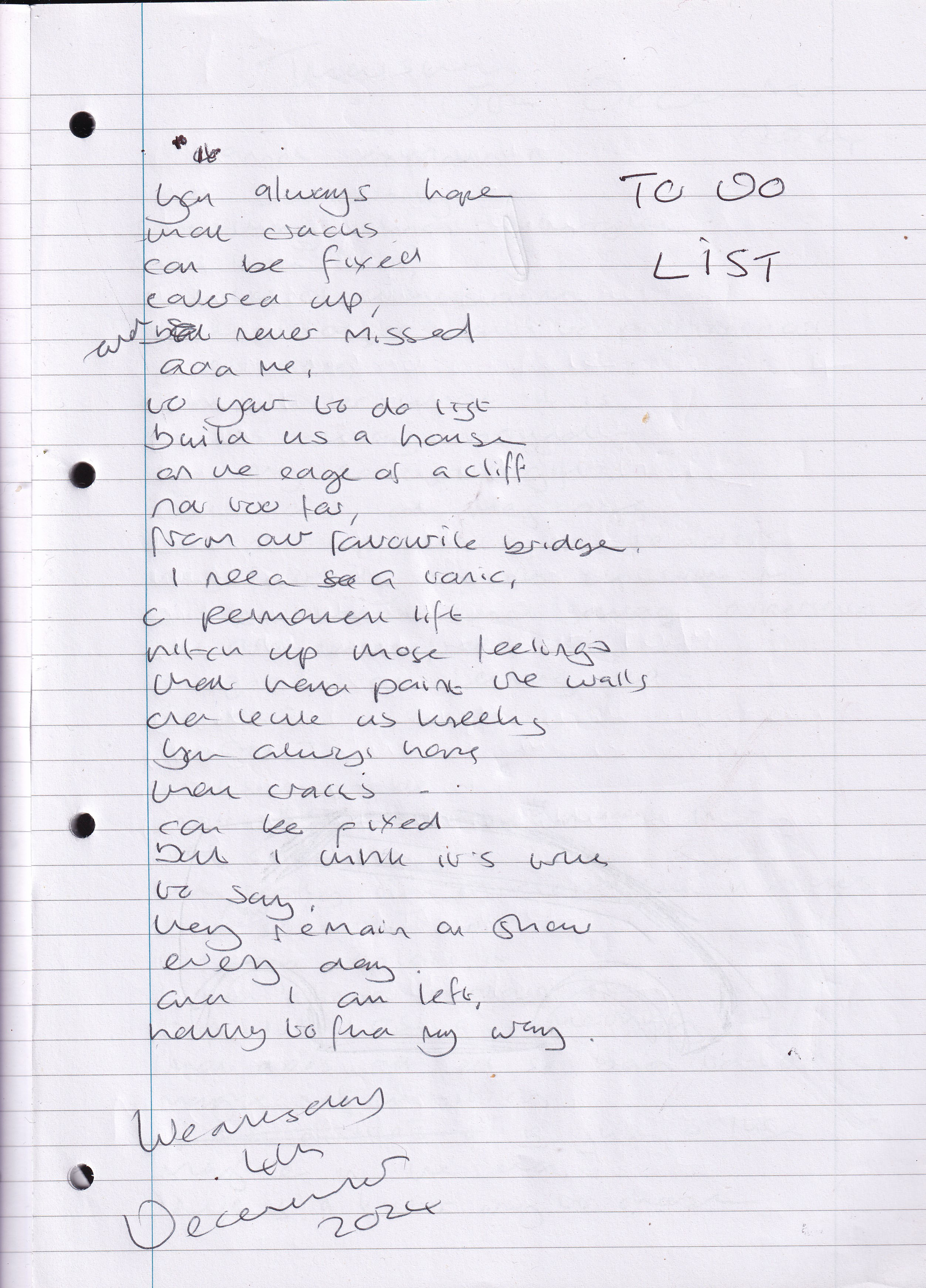 To Do List – Written Wednesday 4th December 2024 (Aged 49)