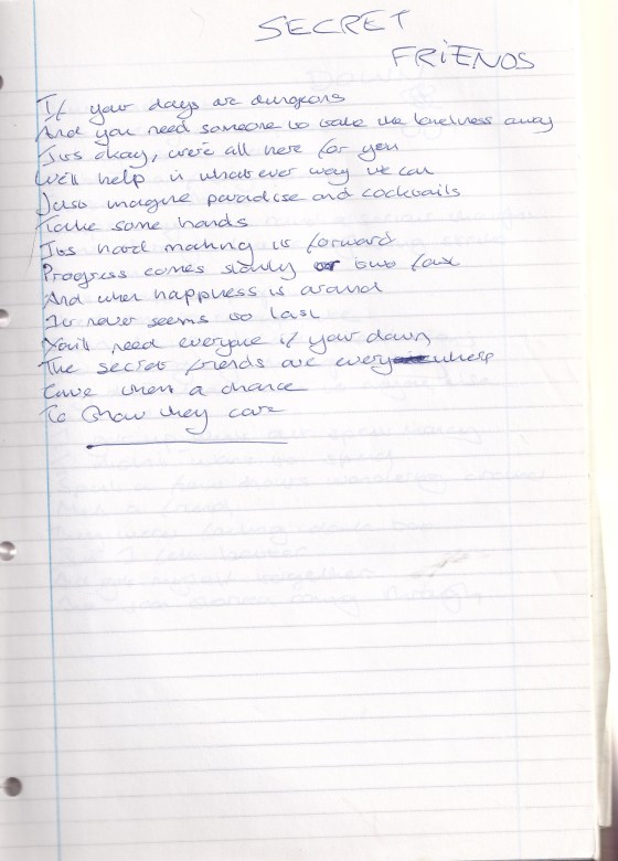 Secret Friends if your days are dungeons and you someone –to take the loneliness away it is okay, we are … More