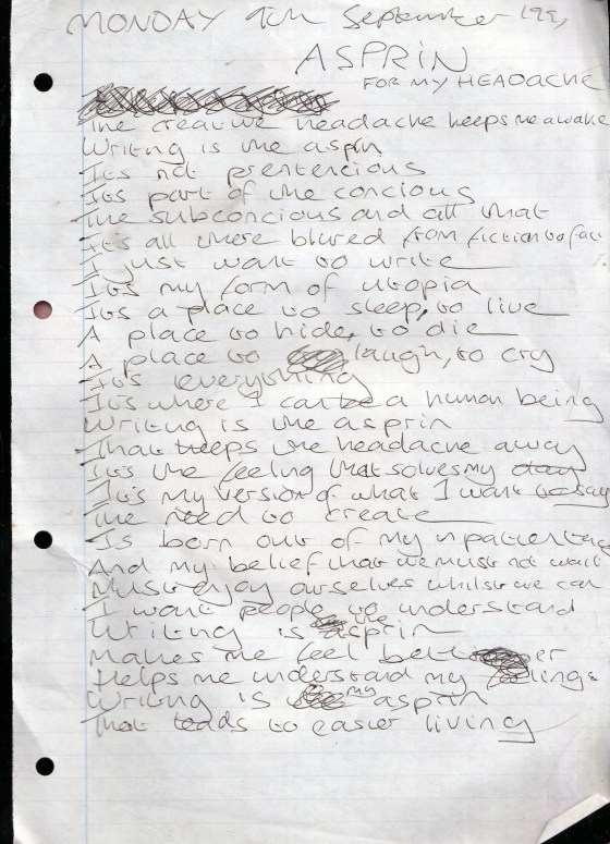 Aspirin For My Headache – Written Monday 9th September 1997 (Aged 22)