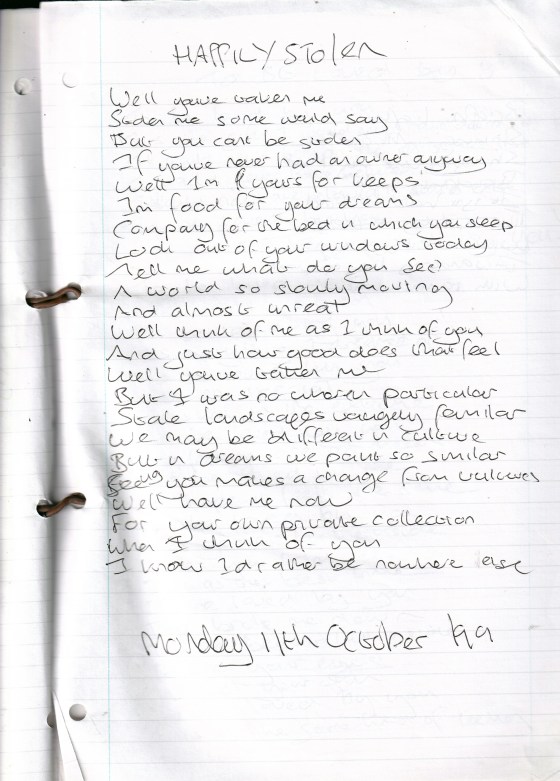 Happily Stolen – Written Monday 1th October 1999 (Aged 24)