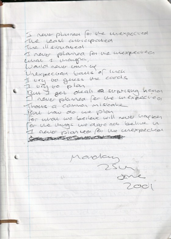 Unexpected – Written Monday 25th June 2001 (Aged 26)