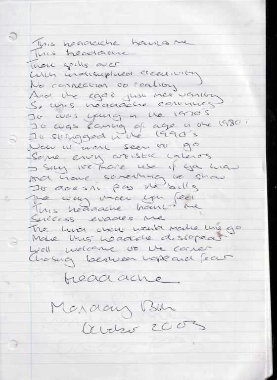 Headache – Written Monday 13th October 2003 (Aged 28)