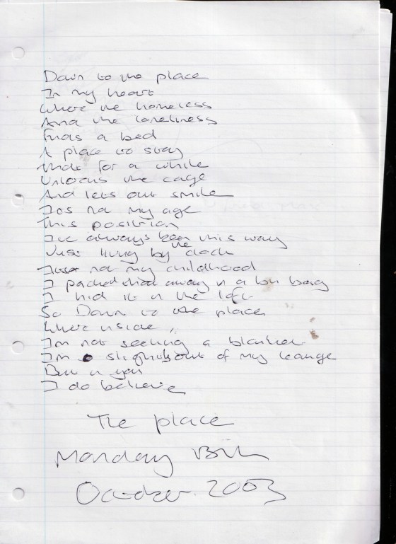 The Place down to the place in my heartwhere the homelessand the loneliness finds a bed a place to stay … More
