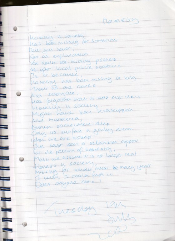 Honesty – Written Tuesday 19th July 2005 (Aged 30)