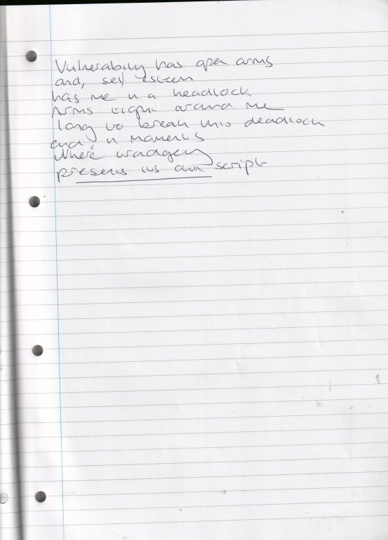 Vulnerability vulnerability has open arms and, self esteem – has me in a headlock its arms are tight around me … More