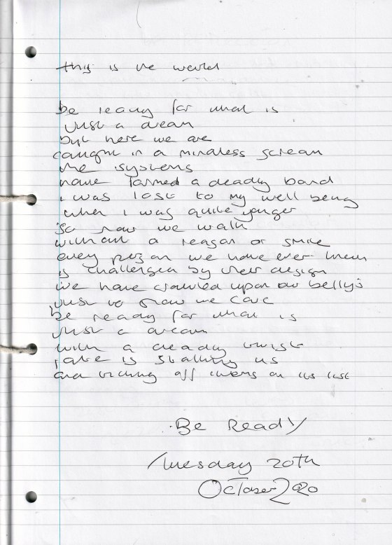 Be Ready – Written Tuesday 20th October 2020 (Aged 45)