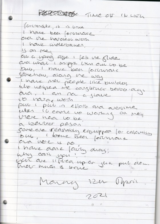 Time Off in Lieu – Written Monday 12th April 2021 (Aged 46)