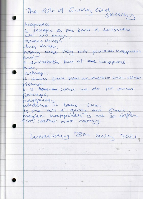 The Art of Giving and Sharing – Written Wednesday 28th July 2021 (Aged 46)