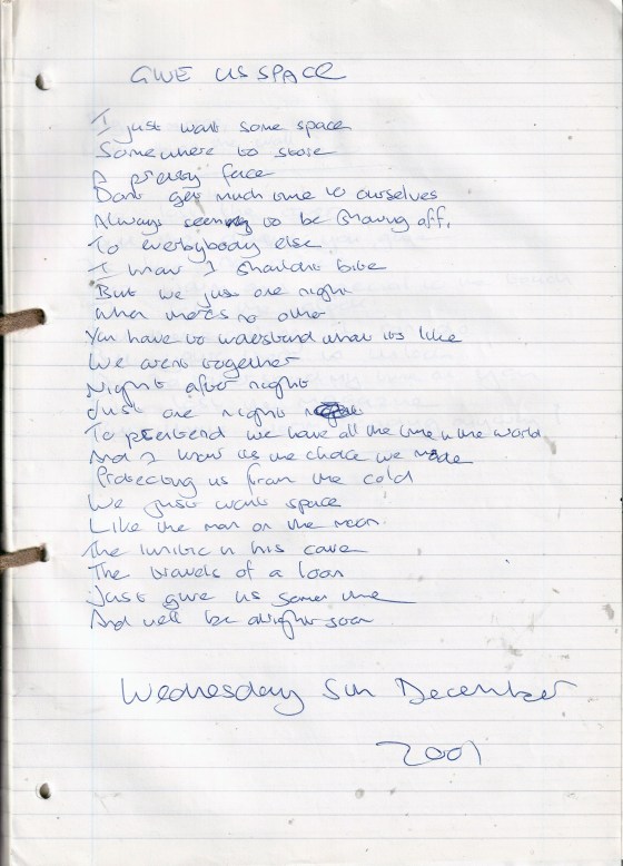Give Us Space – Written Wednesday 5th December 2001 (Aged 26)