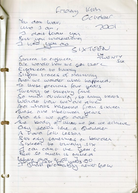 Sixteen to Twenty Six – Written Friday 19th October 2001 (Aged 26)